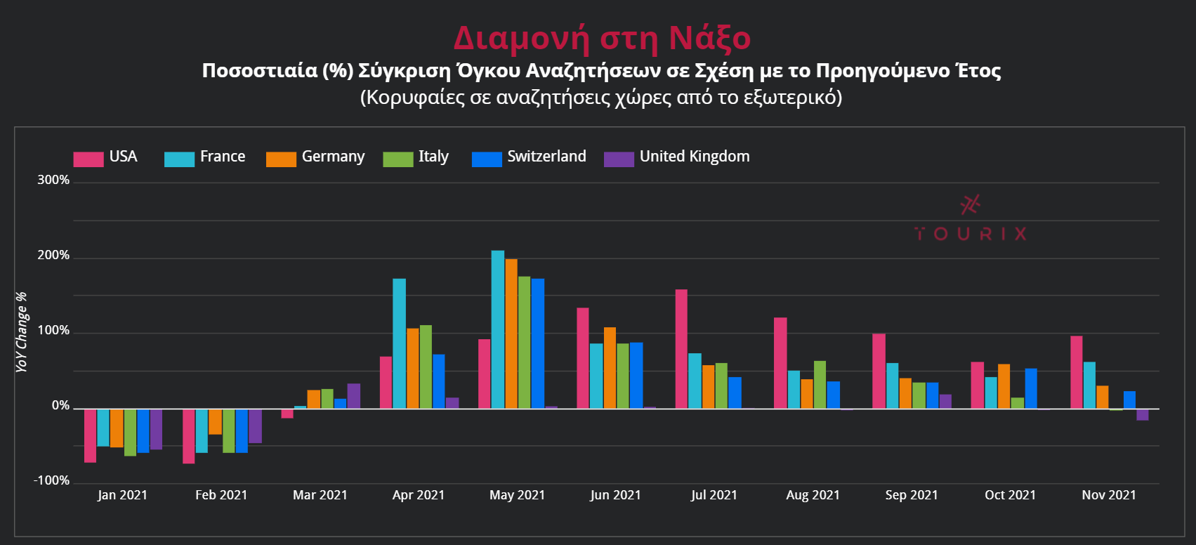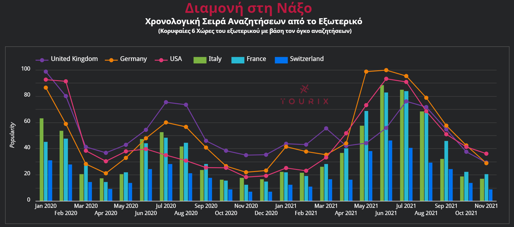 Συνολικά για το 2021, οι 3 τοπ χώρες στις διαδικτυακές αναζητήσεις για διαμονή στη Νάξο είναι η Γερμανία, οι ΗΠΑ στην δεύτερη θέση και στην τρίτη θέση βρίσκεται το Ηνωμένο Βασίλειο. Αυτή ήταν η τριάδα και για το 2020 με την διαφορά πως στην πρώτη θέση ήταν το Ηνωμένο Βασίλειο, μετά η Γερμανία και στην τρίτη θέση οι ΗΠΑ.