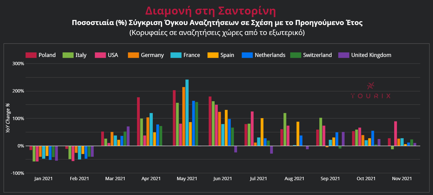 Σε ετήσια βάση, όσον αφορά τις αναζητήσεις τον Νοέμβριο του 2021 σε σχέση με τον Νοέμβριο του 2020, παρατηρήθηκε σημαντική αύξηση 28% από την Πολωνία, 90% από τις ΗΠΑ, 27% από τη Γερμανία, 29% από τη Γαλλία, 6% από την Ισπανία, 12% από την Ολλανδία, 24% από την Ελβετία, 11% από το Ηνωμένο Βασίλειο και μείωση 14% από την Ιταλία.