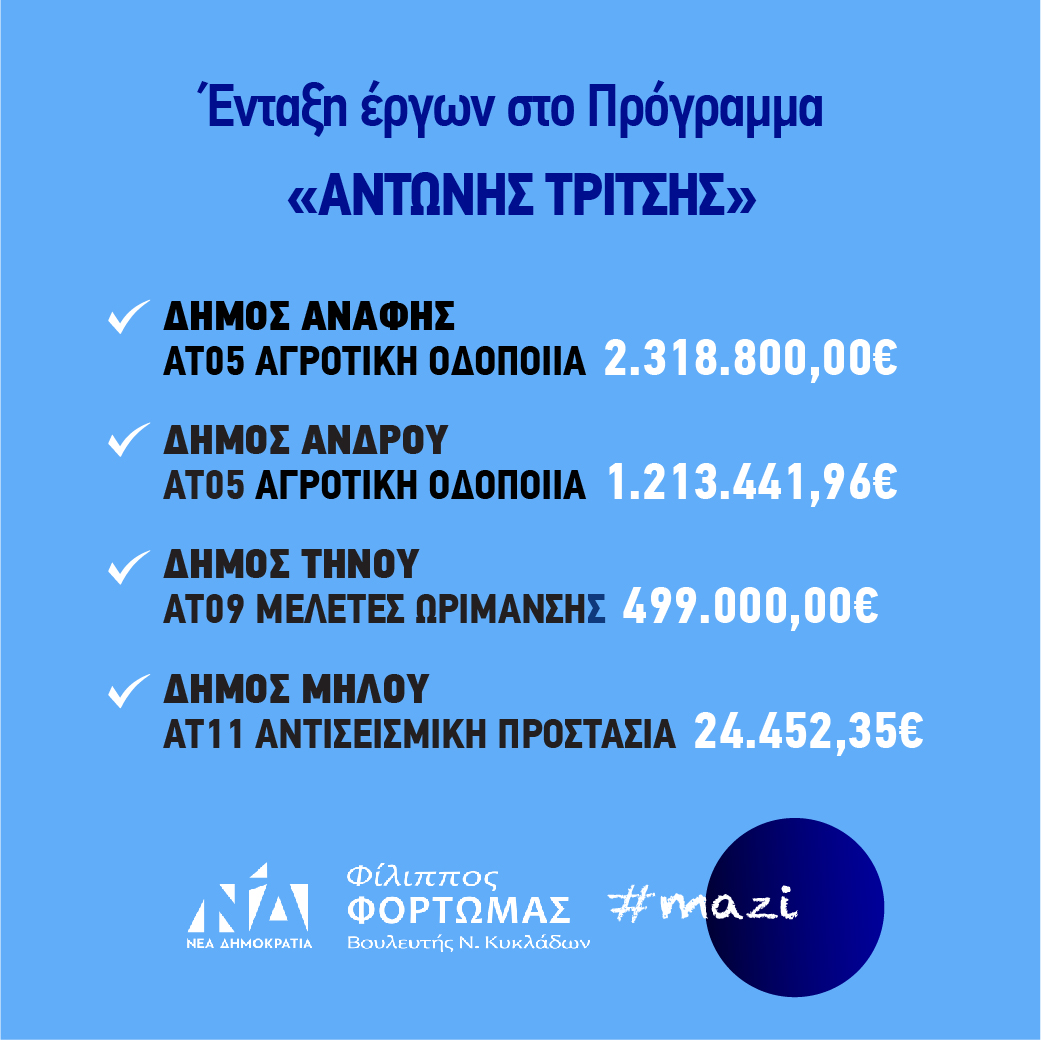 Τα συγχαρητήριά του εξέφρασε ο βουλευτής Κυκλάδων της Νέας Δημοκρατίας κ. Φίλιππος Φόρτωμας, για την ένταξη έργων ύψους 4,5 εκ., ευρώ στο πρόγραμμα «ΑΝΤΩΝΗΣ ΤΡΙΤΣΗΣ» που πέτυχαν οι Δήμοι Άνδρου, Τήνου, Μήλου και Ανάφης, σε συνεργασία με το Υπουργείο Εσωτερικών. Τα εν λόγω έργα θα αλλάξουν ουσιαστικά την καθημερινότητα των νησιωτών μας και θα βελτιώσουν καθοριστικά τις υποδομές των νησιών μας. Σταθερή στις δεσμεύσεις της, η Κυβέρνηση του Κυριάκου Μητσοτάκη έχει ενεργοποιήσει χρηματοδοτικά εργαλεία, που λειτουργούν ως μοχλοί ανάπτυξης στις τοπικές κοινωνίες.