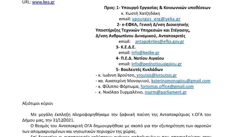 Με επιστολή της, η Δήμαρχος Κέας, κ. Ειρήνη Βελισσαροπούλου, διαμαρτυρήθηκε στους αρμόδιους φορείς για την ξαφνική παύση της Ανταποκρίτριας του ΟΓΑ του Δήμου Κέας. Η απόφαση αυτή αποκλείει τους κατοίκους του νησιού από την ισότιμη πρόσβαση στις υπηρεσίες ασφάλισης του ΕΦΚΑ. Ζητά επομένως να εξεταστεί σοβαρά η πιθανότητα ανάκλησης της.