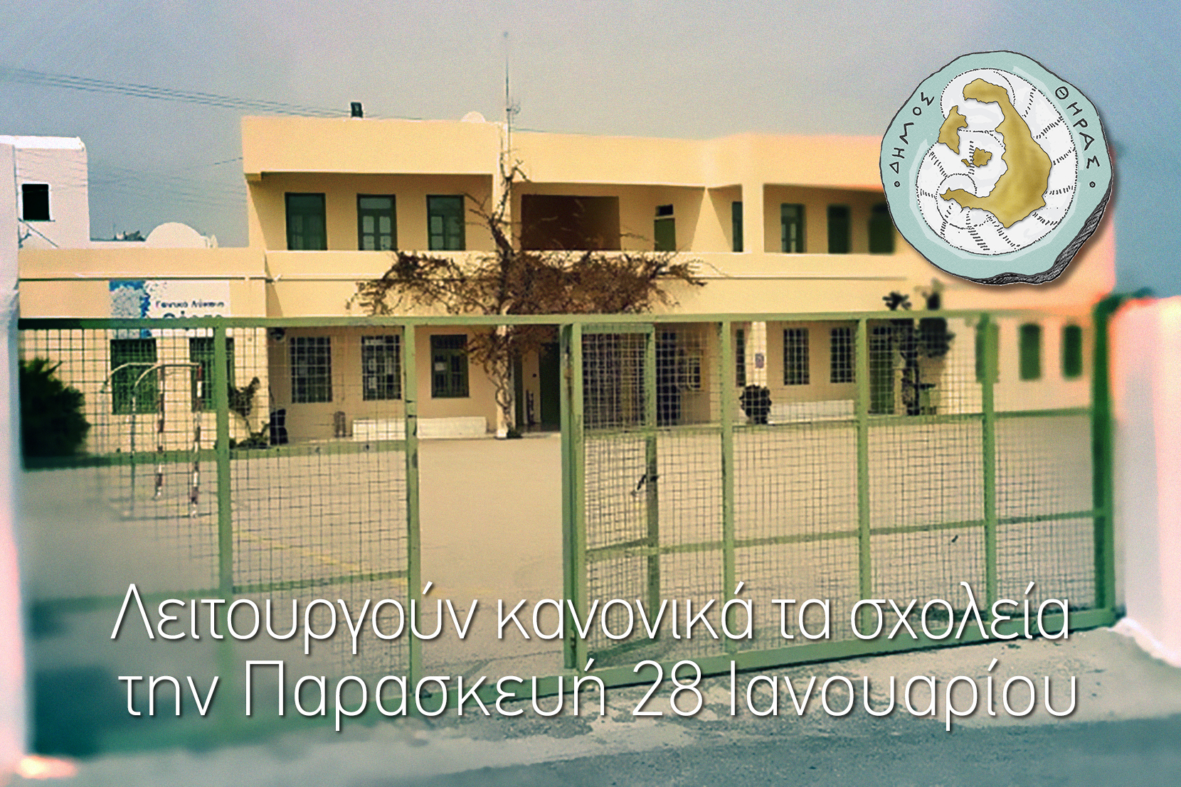 Ο Δήμος Θήρας ενημερώνει ότι θα λειτουργήσουν κανονικά οι Εκπαιδευτικές μονάδες Πρωτοβάθμιας και Δευτεροβάθμιας Εκπαίδευσης, καθώς και των Δημοτικών Παιδικών Σταθμών του Δήμου Θήρας αύριο Παρασκευή 28 Ιανουαρίου.