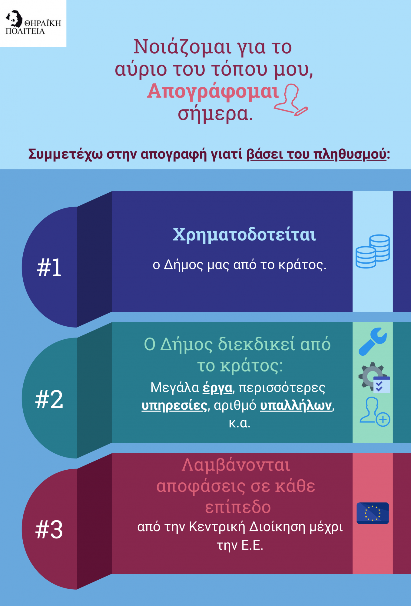 Η συμμετοχή μας στην απογραφή είναι εξαιρετικά σημαντική, ο πληθυσμός του τόπου μας είναι ένα αριθμητικό μέγεθος που καθορίζει πολύ σημαντικά εργαλεία για την Τοπική Αυτοδιοίκηση και κατά συνέπεια για την ίδια μας τη ζωή στα νησιά μας. Μην ξεχνάτε ότι αν δεν απογραφούμε σωστά χάνουμε περισσότερα αξιώματα και τον λόγο μας απέναντι σε όλους τους φορείς και στα δικαιώματά μας.