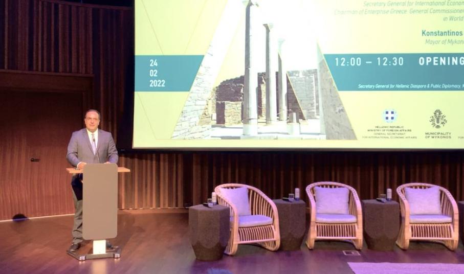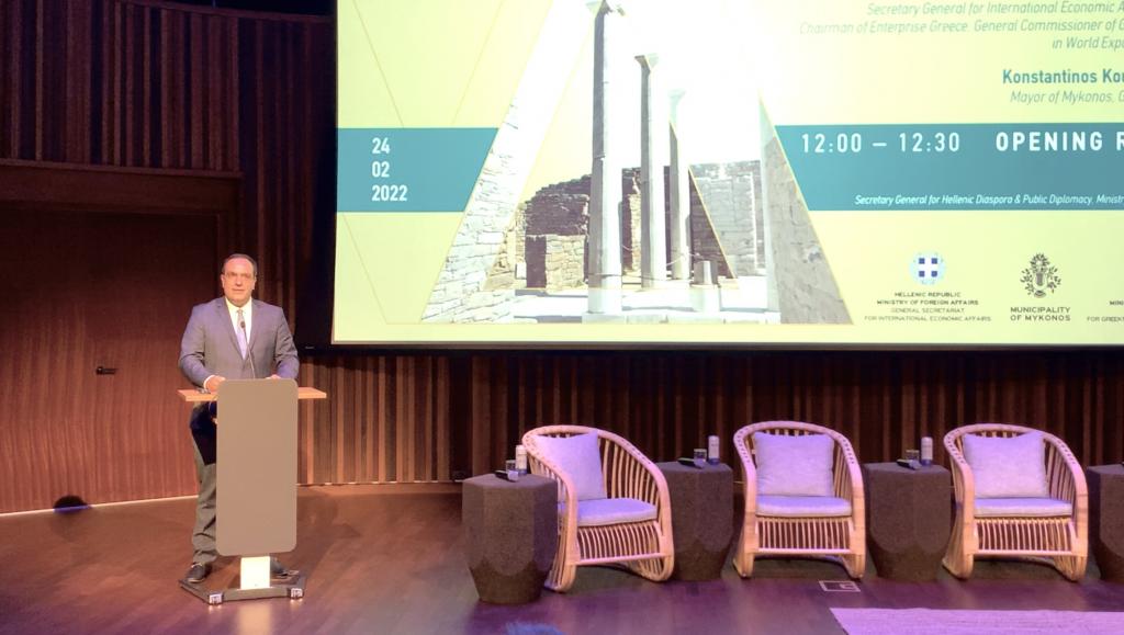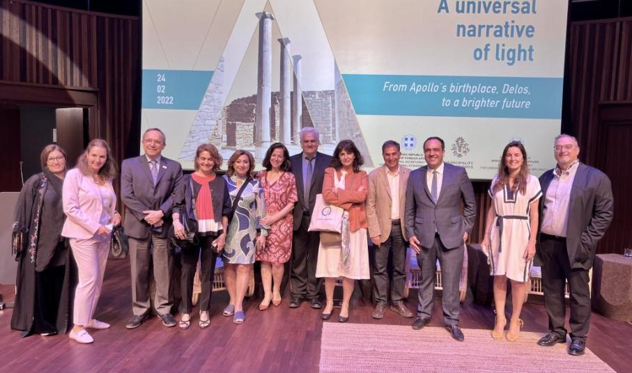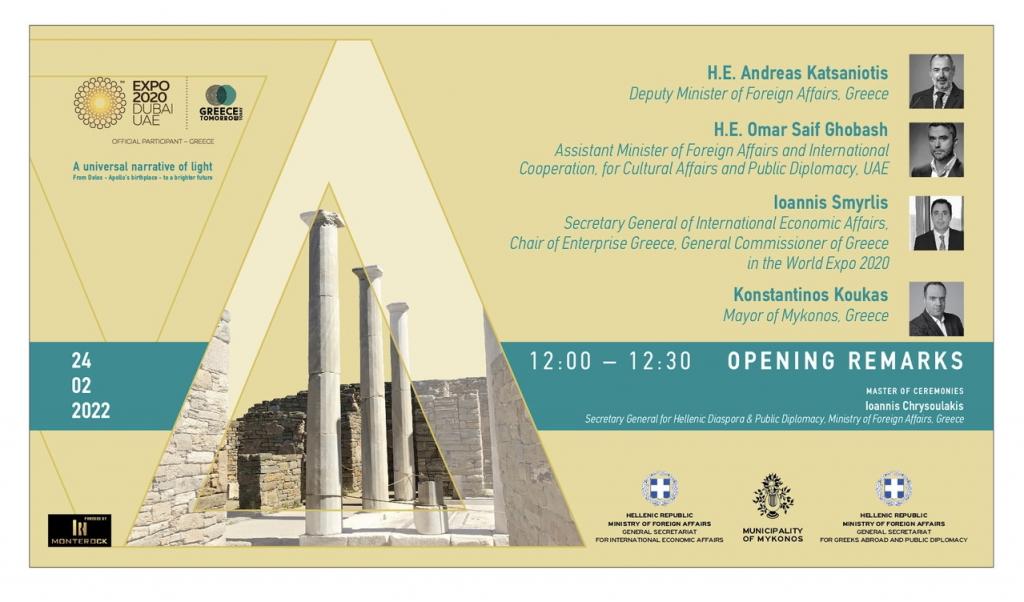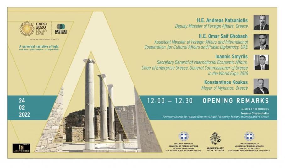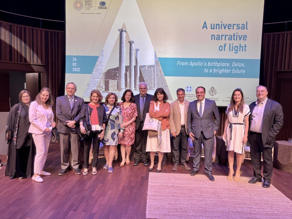 Το Υπουργείο Εξωτερικών με την Enterprise Greece και το ΔήμοΜυκόνου διοργάνωσαν την Πέμπτη 24 Φεβρουαρίου 2022 εκδήλωσημε τίτλο «A Universal Narrative of Light – From Apollo’s birthplace,Delos, to a brighter future».Η εκδήλωση πραγματοποιήθηκε στο Terra Auditorium (SustainabilityDistrict, Expo2020) στο πλαίσιο της Ελληνικής παρουσίας στηνΠαγκόσμια Έκθεση EXPO 2020 Dubai. Μια έκθεση που την έχουνεπισκεφθεί έως σήμερα 15 εκατομμύρια επισκέπτες, ενώ έχεισημειώσει μια έντονη παγκόσμια δραστηριότητα στα κοινωνικάδίκτυα. Στόχος ήταν η ανάδειξη της σύγχρονης ταυτότητας τηςΕλλάδας ως χώρα με εξωστρεφή κουλτούρα, την προβολή της αξίαςτης διεθνούς συνεργασίας, καθώς και τη συμβολή και το αντίκτυποτης επιστήμης, της τεχνολογίας και της τέχνης στον διαπολιτισμικόδιάλογο.Κατά τη διάρκεια της εκδήλωσης «A Universal Narrative of Light –From Apollo’s birthplace, Delos, to a brighter future»πραγματοποιήθηκαν ενδιαφέρουσες ομιλίες από τους κ. ΑνδρέαΚατσανιώτη, Υφυπουργό Εξωτερικών, κ. Omar Saif Ghobash,Αναπληρωτή Υπουργό Εξωτερικών και Διεθνούς ΣυνεργασίαςΗνωμένων Αραβικών Εμιράτων, κ. Ιωάννη Σμυρλή, Γενικό ΓραμματέαΔιεθνών Οικονομικών Σχέσεων και Εξωστρέφειας καθώς και τοΔήμαρχο Μυκόνου, κ. Κωνσταντίνο Κουκά. Παρόντες επίσης με ενδιαφέρουσες ομιλίες στο πάνελ ανάμεσα σεάλλους και ο Δημήτρης Αθανασούλης Έφορος Αρχαιοτήτων Κυκλάδωνκαι η Ελευθερία Ντεκό, σχεδιάστρια φωτισμού. Ιδιαίτερη αίσθησηπροκάλεσε η ομιλία της Αλεξάνδρας Μητσοτάκη, Πρόεδρο και συν-Ιδρύτρια του World Human Forum πού είχε θέμα τη Δήλο. Παρόντεςπολλοί σημαντικοί εκπρόσωποι του επιχειρηματικού χώρου από τηνΕλλάδα και από τον κόσμο καθώς και ο Έλληνας Πρέσβης στα