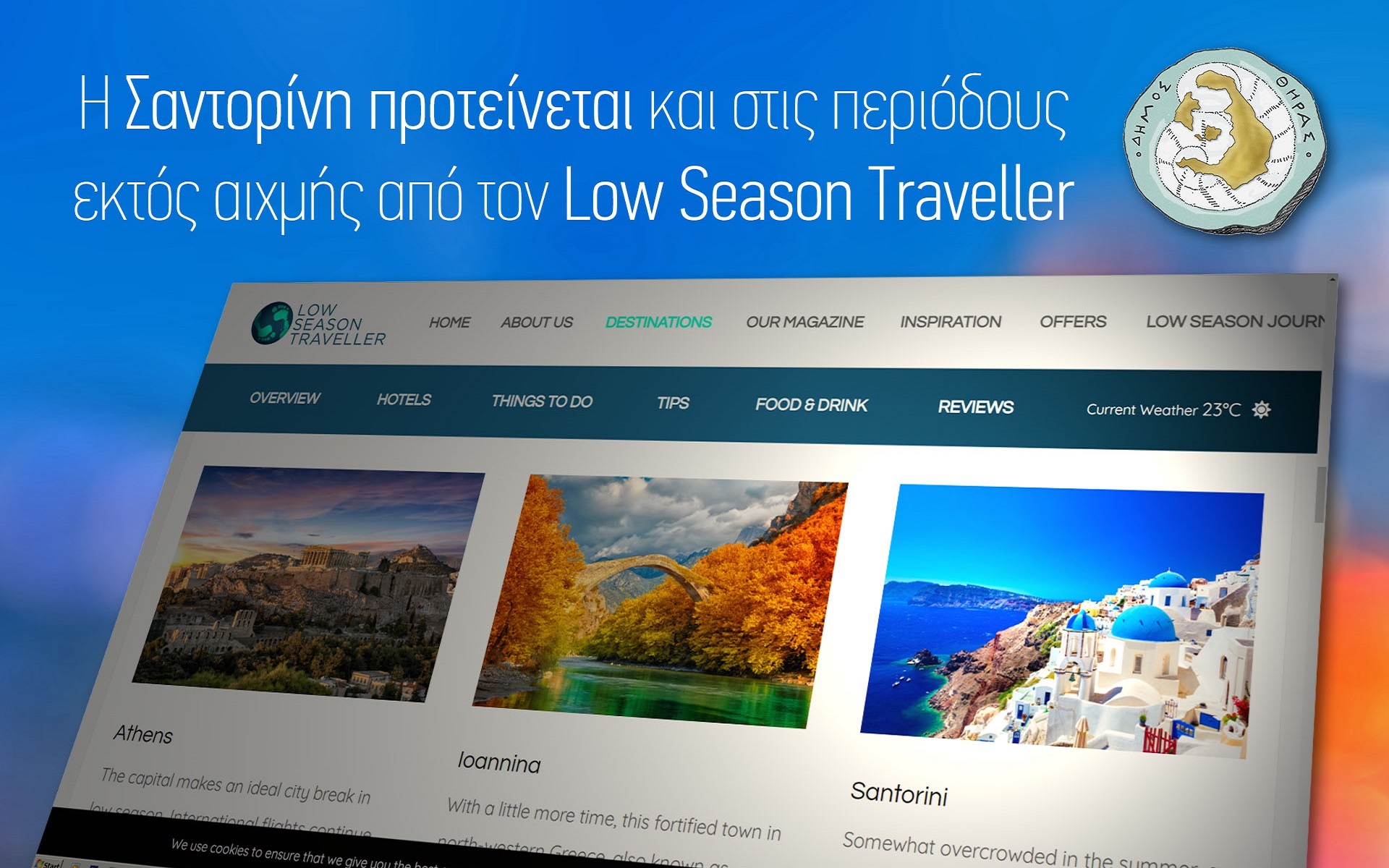 Με στόχο την επιμήκυνση της τουριστικής περιόδου, η Σαντορίνη παρουσιάζεται και προωθείται από τον Low Season Traveller, τον πρώτο οργανισμό στον κόσμο που είναι εξειδικευμένος στην προώθηση των ταξιδιών κατά τις περιόδους εκτός αιχμής.