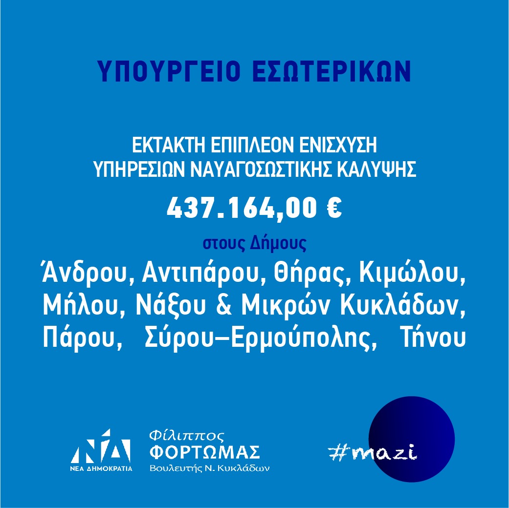 Την ικανοποίησή του εξέφρασε ο βουλευτής Κυκλάδων της Νέας Δημοκρατίας κ. Φίλιππος Φόρτωμας, για την επιχορήγηση ύψους 437.164,00 €, για την κάλυψη δαπανών παροχής υπηρεσιών ναυαγοσωστικής κάλυψης σε οργανωμένες ή μη παραλίες, που εξασφάλισαν οι Δήμοι Άνδρου, Αντιπάρου, Θήρας, Κιμώλου, Μήλου, Νάξου & Μικρών Κυκλάδων, Πάρου, Σύρου – Ερμούπολης και Τήνου, κατόπιν απόφασης του Αναπληρωτή Υπουργού Εσωτερικών, κ. Στέλιου Πέτσα.
