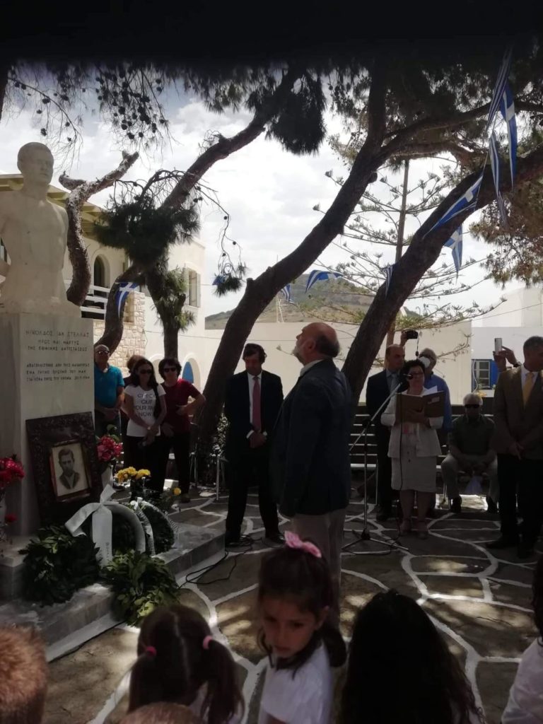 Την Κυριακή το πρωΐ, συνοδευόμενος από την συντονίστρια της Ο.Μ. ΣΥΡΙΖΑ – Π.Σ. Πάρου – Αντιπάρου Μαριαλένα Σαρρή – Παναγάκη, συμμετείχε και κατέθεσε στεφάνι στην εκδήλωση μνήμης στη Μάρπησσα προς τιμήν του Παριανού ήρωα Νίκου Στέλλα που απαγχονίστηκε τον Μάϊο του 1944 από τους Γερμανούς κατακτητές και που διοργάνωσε ο Δήμος της Πάρου. Στο σύντομο χαιρετισμό του, ανέδειξε τον ηρωϊσμό της πράξης του Νίκου Στέλλα που μαζί με δεκάδες χιλιάδες Έλληνες πατριώτες της Εθνικής Αντίστασης πάλεψαν για τα ιδανικά της Ελευθερίας, της Δημοκρατίας και της Κοινωνικής Δικαιοσύνης. Επίσης επισήμανε με έμφαση την ανάγκη εγρήγορσης και αποφασιστικής αντιμετώπισης ενάντια στο φασισμό που σηκώνει πάλι κεφάλι τόσο στην Ελλάδα αλλά και σε ολόκληρη την Ευρώπη.