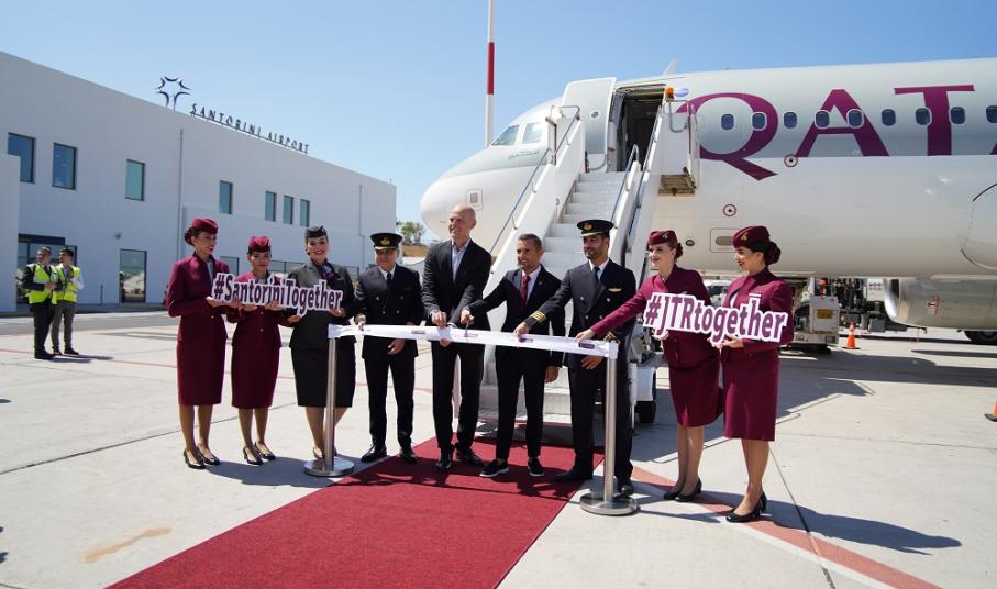 Η πρώτη πτήση από Ντόχα προς Σαντορίνη πραγματοποιήθηκε την Τρίτη 7 Ιουνίου από αεροσκάφος A320 με 12 θέσεις στη Διακεκριμένη Θέση και 132 θέσεις στην Οικονομική Θέση. Το αεροσκάφος προσγειώθηκε στο Διεθνές Αεροδρόμιο Θήρας για πρώτη φορά και στην υποδοχή του παρευρέθηκαν ανώτατα στελέχη της Fraport Greece.
