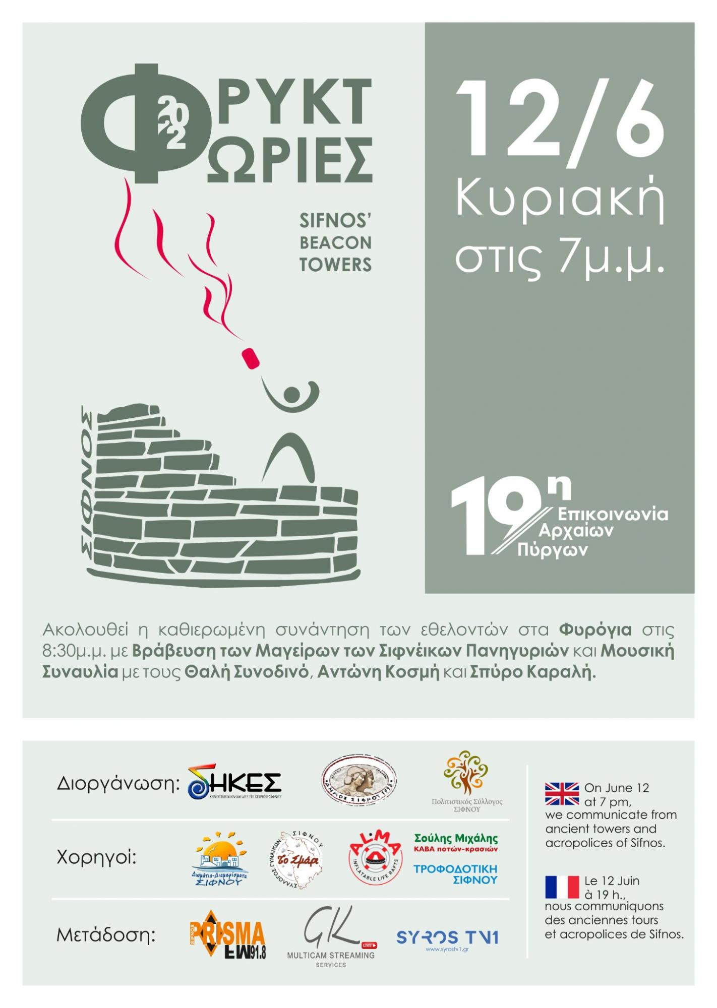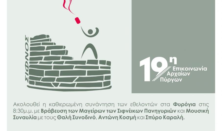 20 χρόνια μετά την πρώτη σύγχρονη επικοινωνία των Αρχαίων πύργων της Σίφνου και μετά από μια χρονιά αναγκαστικού "κλεισίματος", την Κυριακή 12 Ιουνίου 2022, ξαναδίνουμε ζωή στα απομεινάρια του αρχαιολογικού πλούτου της Σίφνου, με την 19η ετήσια επικοινωνία εκατοντάδων εθελοντών