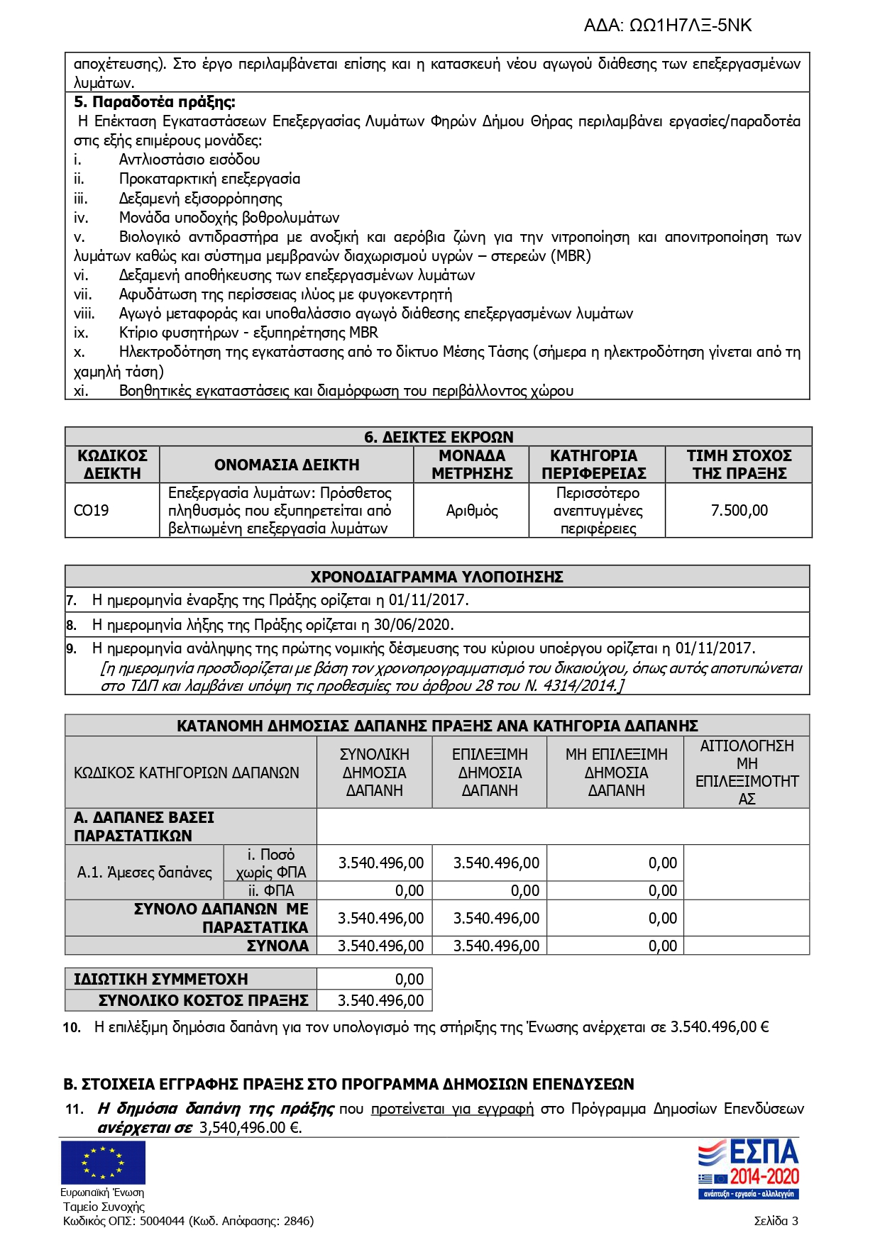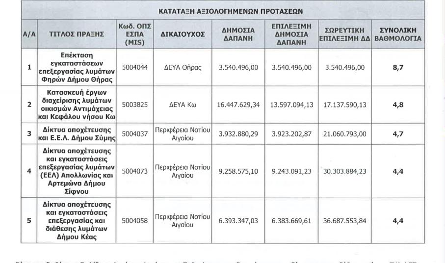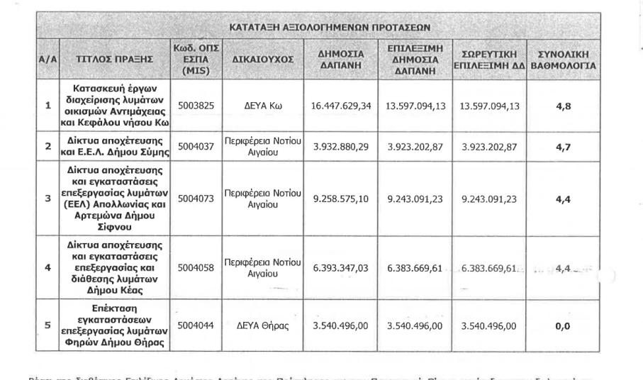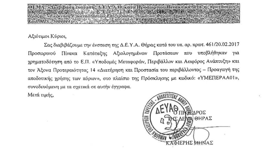 Το συγκεκριμένο έργο ήταν ενταγμένο στο περιφερειακό ΕΣΠΑ. Η πρόσκληση για συμμετοχή στο πρόγραμμα έγινε τον Οκτώβριο του 2016. Η ΔΕΥΑ Θήρας υπό τη διοίκηση του κ. Μηνά Καφιέρη, υπέβαλλε αίτημα ένταξης το οποίο δεν αξιολογήθηκε στον προσωρινό πίνακα αξιολόγησης στις 20/02/2017 με αποτέλεσμα να απορριφθεί. Εν συνεχεία η ΔΕΥΑΘ υπέβαλλε ένσταση στη Διαχειριστική Αρχή η οποία έγινε αποδεκτή, με αποτέλεσμα στον νέο πίνακα αξιολόγησης την 27/03/2017 (Α.Π. 865) να λάβει την πρώτη θέση με 8,7 βαθμούς. Το έργο δημοπρατήθηκε την 26/06/2018 (ΑΔΑ: 6ΖΥ8ΟΕΨΠ-Ρ65) και η σύμβαση υπεγράφη με τον εργολάβο την 21/12/2018. Ο συμβατικός χρόνος ολοκλήρωσης του έργου ήταν έως την 21/12/2020 σύμφωνα με τη σύμβαση.