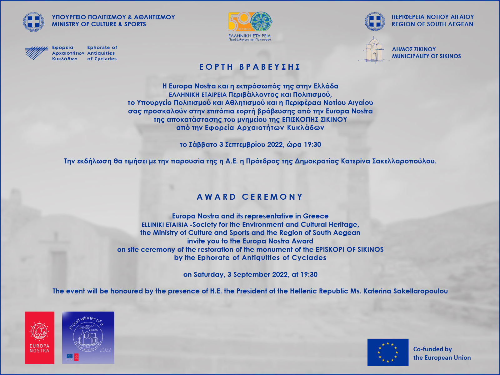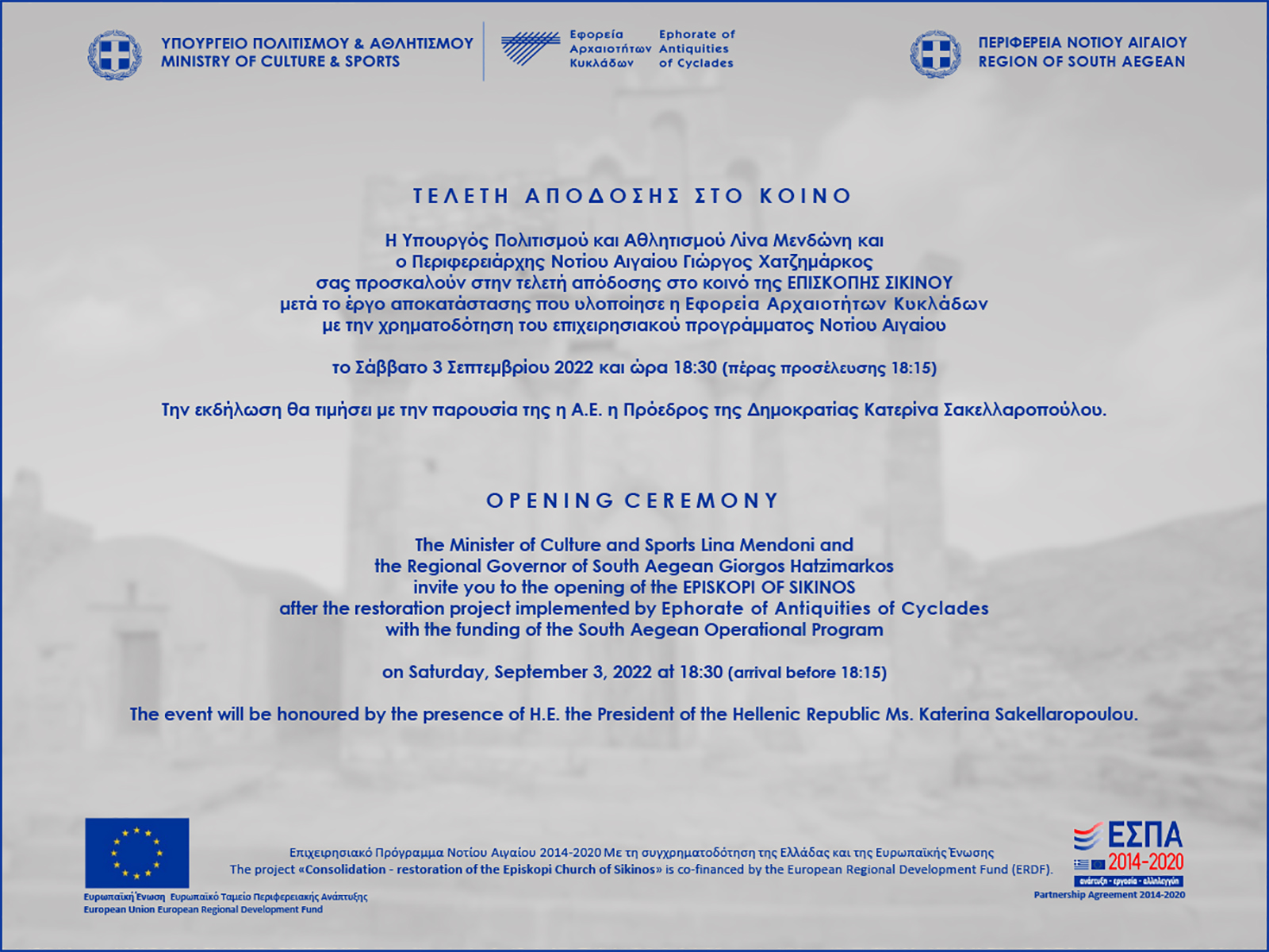 Η Υπουργός Πολιτισμού, Λίνα Μενδώνη θα παρευρεθεί στη Σίκινο, το Σάββατο, 3 Σεπτεμβρίου, στο πλαίσιο της τελετής για την απόδοση στην τοπική κοινωνία της Επισκοπής Σικίνου.
