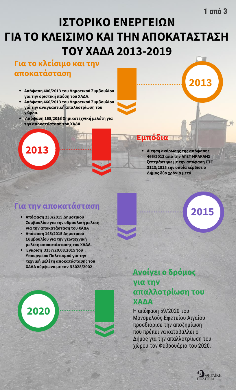 Στα αρχεία που συνοδεύουν αυτό το δελτίο τύπου παρουσιάζεται όλο το ιστορικό των ενεργειών που πραγματοποιήθηκαν για τη δημιουργία εγκατάστασης ενδιάμεσης και οριστικής διαχείρισης απορριμμάτων καθώς και για την αποκατάσταση του ΧΑΔΑ. Ο Δήμαρχος και οι συμπράττουσες παρατάξεις Ρούσσου-Ορφανού καλό θα είναι να λάβουν υπόψη τους το ιστορικό και τις καθυστερήσεις λόγω των δικαστικών προσφυγών. Θα κατανοήσουν τι διακυβεύεται σε περίπτωση νέου γύρου προσφυγών στην νέα θέση που έχουν επιλέξει στο «Αλωνάκι».