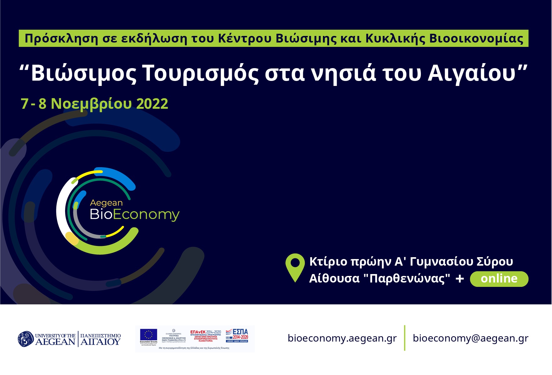 Υπό το πρίσμα των ευρωπαϊκών και εθνικών προτεραιοτήτων για την κυκλική βιοοικονομία και τον αειφόρο τουρισμό, σκοπός της διημερίδας για τον βιώσιμο τουρισμό που θα γίνει τον Νοέμβριο στη Σύρο, θα είναι η διερεύνηση δυνατοτήτων ως προς την βιωσιμότητα του κλάδου του Τουρισμού και την στροφή προς μια πιο κυκλική οικονομια, μέσα από την ανταλλαγή εμπειριών και παρουσίαση βέλτιστων πρακτικών μείωσης περιβαλλοντικού αποτυπώματος σε τουριστικές επιχειρήσεις.