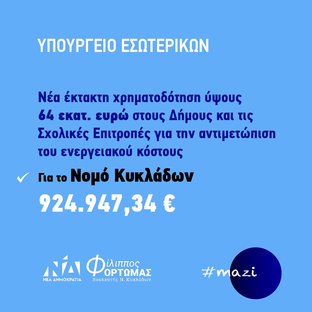 Τα συγχαρητήριά τουεξέφρασε ο βουλευτής Κυκλάδων της Νέας Δημοκρατίας κ. Φίλιππος Φόρτωμας, για τις επιχορηγήσεις συνολικού ποσού 924.947,34€ που εγκρίθηκαναπό την ηγεσία του Υπουργείου Εσωτερικών, με απόφαση του Αναπληρωτή Υπουργού κ. Στέλιου Πέτσα, για την κάλυψη λειτουργικών και λοιπών γενικών δαπανών τους, την κάλυψη των λειτουργικών δαπανών των σχολείων τους και την υλοποίηση έργων και επενδυτικών δραστηριοτήτων τους.