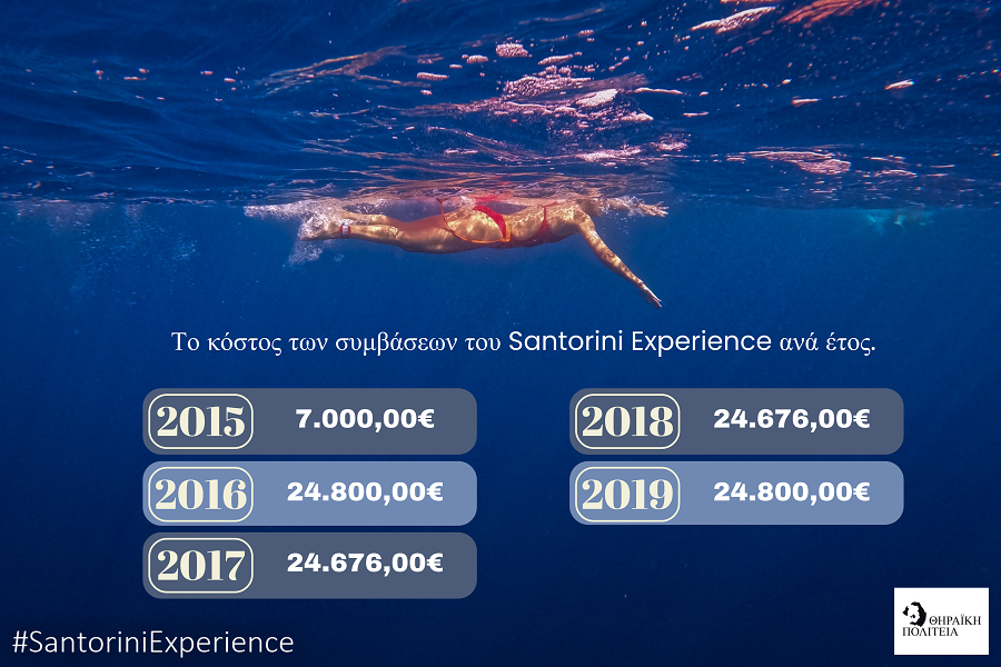 Η αλήθεια είναι ότι η σύμβαση με την διοργανώτρια εταιρεία του Santorini Experience δεν κόστισε ποτέ πάνω από 24.800,00€ συμπεριλαμβανομένου Φ.Π.Α. από το 2015 έως το 2019. Την πρώτη χρονιά διοργάνωσης του η απόφαση πάρθηκε μόλις δύο μήνες πριν τη πραγματοποίηση και ήταν χρονιά διερευνητική, με μικρότερη συμμετοχή αθλητών και λιγότερες δαπάνες επικοινωνίας από την πλευρά της εταιρείας γι’ αυτό και το κόστος μικρότερο. Φέτος το Santorini Experience κόστισε 37.200,00€ συμπεριλαμβανομένου Φ.Π.Α.