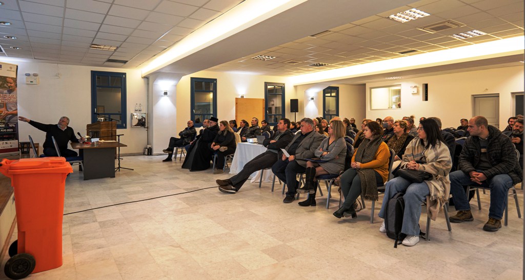 Στη συνέχεια ακολούθησε ομιλία του καθηγητή ΕΜΠ Γεράσιμου Λυμπεράτου με θέμα τη διαχείριση των βιοαποβλήτων και την κυκλική οικονομία και εξηγήθηκαν στο ακροατήριο οι ενέργειες που πρέπει να κάνουν οι πολίτες που επιθυμούν να συμμετέχουν στη σημαντική διαδικασία της διαλογής στην πηγή υπολειμμάτων τροφών στον πορτοκαλί κάδο.