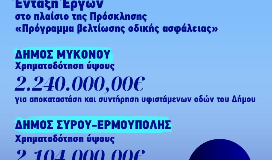 Αναλυτικά, αποφασίστηκε η ένταξη του έργου, ύψους 2.104.000,00 €, με τίτλο: «Βελτίωση ασφάλειας δημοτικού οδικού δικτύου του Δήμου Σύρου-Ερμούπολης», το οποίο αφορά τέσσερα (4) υπεραστικά οδικά τμήματα της νήσου Σύρου και συγκεκριμένα: ΚΔ1: Δημοτική οδός Επισκοπείο-Μάλια, ΚΔ2: Κύρια Δημοτική οδός από διασταύρωση Γαλησσά-Δανακό έως Κίνι, ΚΔ3: Κύρια Δημοτική οδός Σταυρός Ταλάντων-Σεντούκα και ΚΔ4: Κύρια Δημοτική οδός Αζόλιμνος από «Πυρκάλ» έως και επαρχιακή οδό. Επίσης, αποφασίστηκε η ένταξη του έργου, ύψους 2.240.000,00 €, με τίτλο: «Αποκαταστάσεις και συντηρήσεις υφιστάμενων οδών του Δήμου Μυκόνου», το οποίο περιλαμβάνει: 1) εργασίες αποκατάστασης της βατότητας υφιστάμενων δρόμων σε επικίνδυνα σημεία, 2) τοίχους αντιστήριξης σε επικίνδυνες περιοχές, 3) καθαίρεση υπάρχουσας γέφυρας και κατασκευή νέας στην περιοχή Μαού, 4) εργασίες κατασκευής οριζόντιας και κατακόρυφης σήμανσης, διαγράμμισης οδοστρωμάτων και ανακλαστήρων οδοστρώματος και 5) εγκατάσταση νέων χαλύβδινων στηθαίων ασφαλείας σε επικίνδυνες θέσεις οδών.