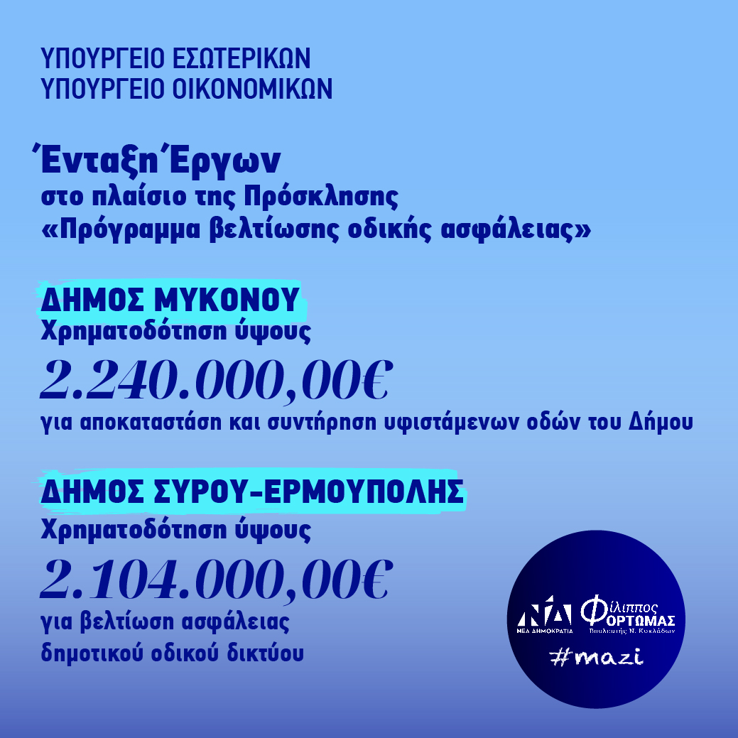 Τα συγχαρητήριά του εξέφρασε ο Βουλευτής Κυκλάδων της Νέας Δημοκρατίας Φίλιππος Φόρτωμας, για τη σημερινή ένταξη δύο πολύ σημαντικών έργων για την οδική ασφάλεια της Σύρου και της Μυκόνου, η οποία αποτελεί αποτέλεσμα της συνεργασίας των Υπουργείων Εσωτερικών και Οικονομικών, με τους Δήμους Σύρου-Ερμούπολης και Μυκόνου.