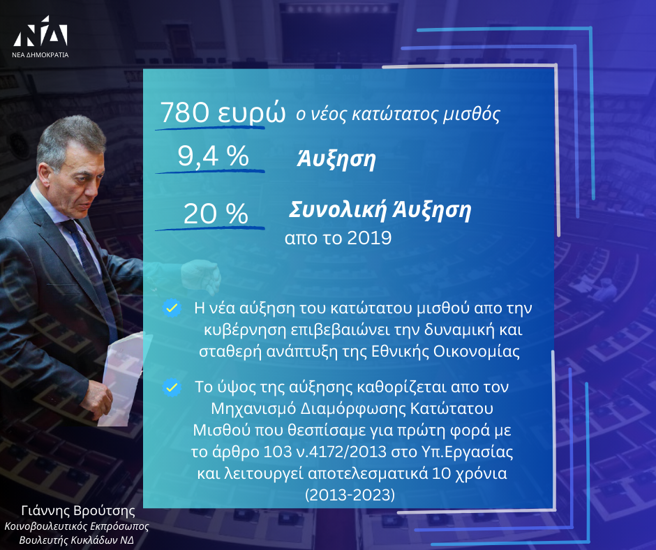 Ο Κοινοβουλευτικός Εκπρόσωπος και Βουλευτής Κυκλάδων Ν.Δ. κ. Γιάννης Βρούτσης, με την ευκαιρία της τελευταίας αύξησης του κατώτατου μισθού, προέβη στην ακόλουθη δήλωση: