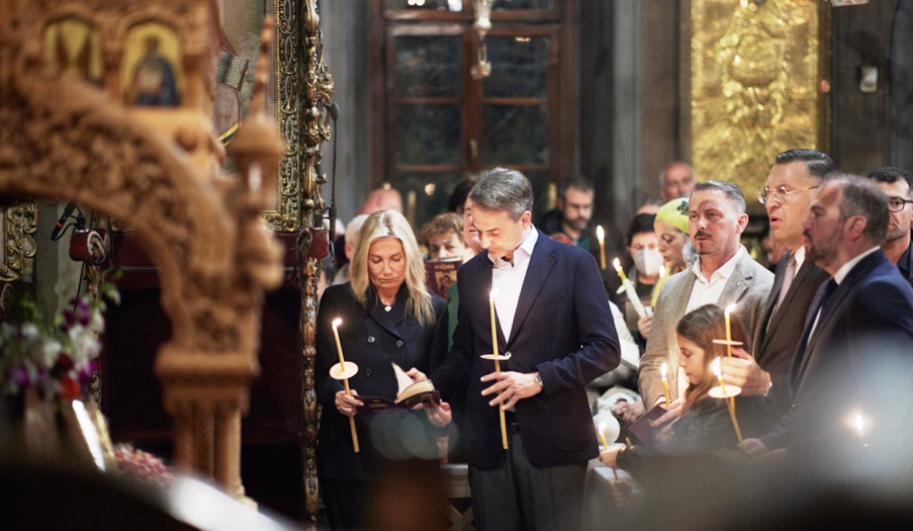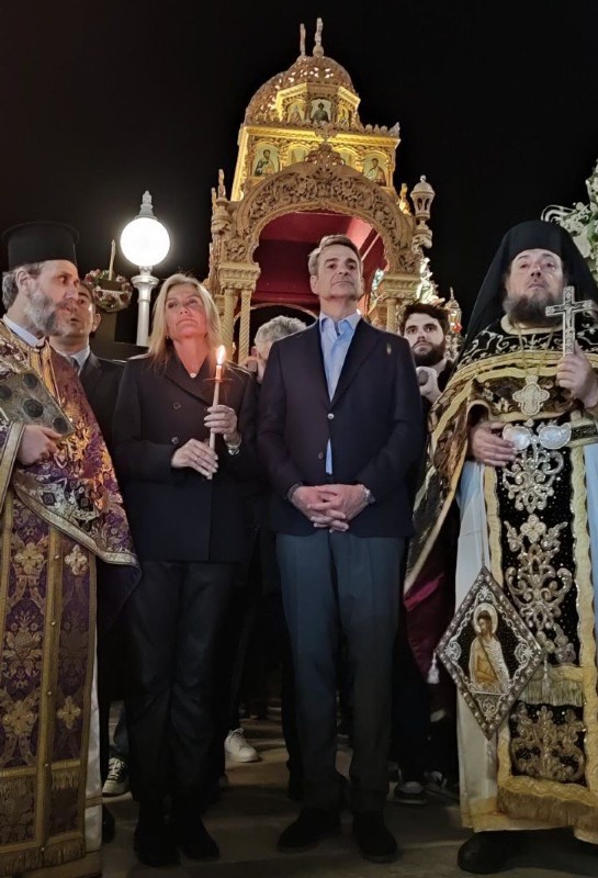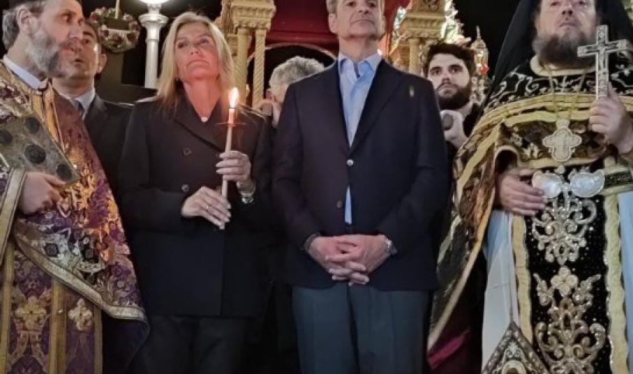 Το βράδυ ο κ. Μητσοτάκης παρακολούθησε την Ακολουθία του Επιταφίου Θρήνου, συνοδευόμενος από τη σύζυγό του, Μαρέβα Γκραμπόφσκι - Μητσοτάκη, στον Ιερό Ναό Ευαγγελιστρίας Τήνου. Από τις πιο συγκινητικές στιγμές στο νησί είναι όταν οι πέντε επιτάφιοι συναντώνται στην πλατεία της Παντάνασσας.