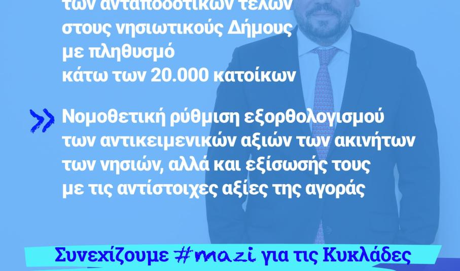 -Την επέκταση των ανταποδοτικών τελών στους νησιωτικούς Δήμους με πληθυσμό κάτω των 20 χιλιάδων κατοίκων