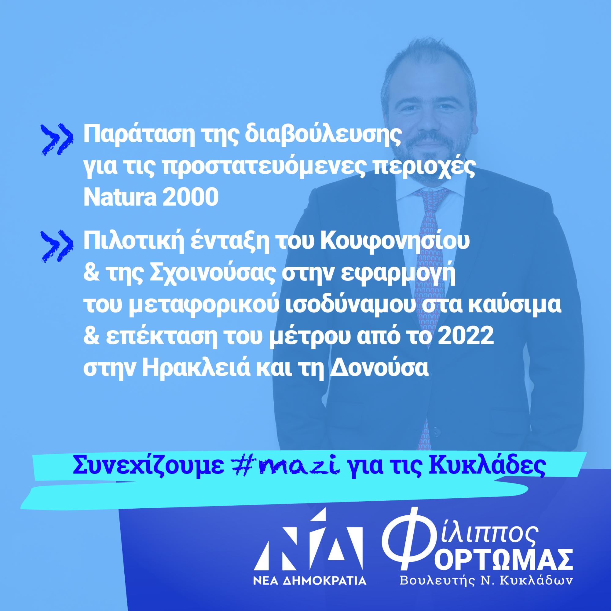 Με την ολοκλήρωση της κοινοβουλευτικής θητείας της απερχόμενης Βουλής, ο Βουλευτής Κυκλάδων, κ. Φίλιππος Φόρτωμας, κάνοντας έναν προσωπικό απολογισμό της τετραετούς δράσης του, διέκρινε τα σημαντικότερα από αυτά που διεκδίκησε και πέτυχε πρόσφατα για τις Κυκλάδες: