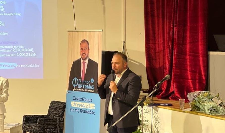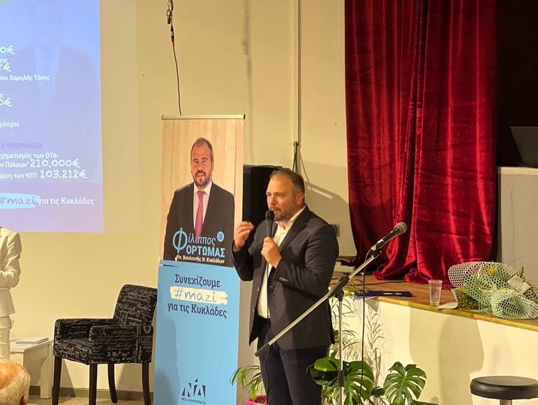 Με μια ομιλία του στη γεμάτη αίθουσα «Γιάνγκος Αργυρόπουλος» του Πολυγωνικού Γενικού Λυκείου Πάρου, συνεχίστηκε η περιοδεία του υποψήφιου Βουλευτή Κυκλάδων Φίλιππου Φόρτωμα στο πλαίσιο της προεκλογικής του δραστηριότητας, δείγμα του θετικού πολιτικού ρεύματος που έχει και η Νέα Δημοκρατία και ο ίδιος στο νησί.