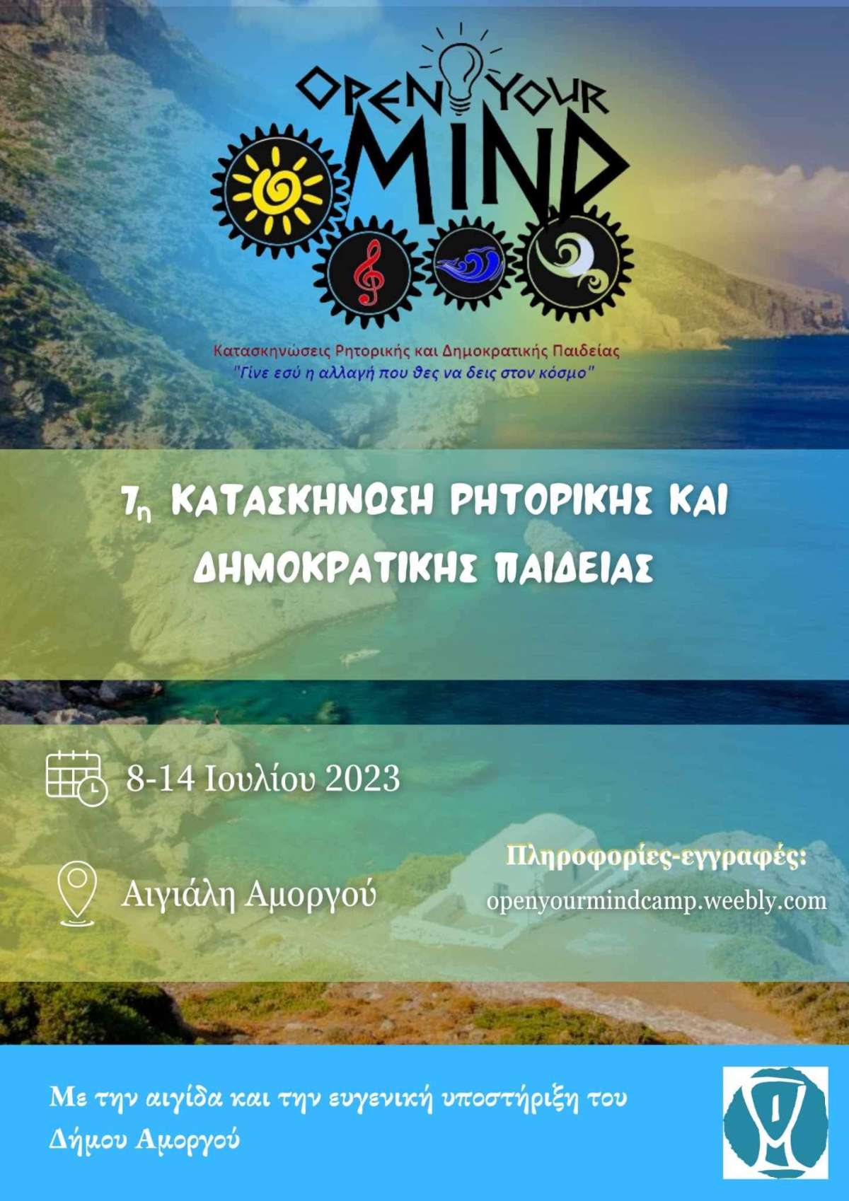 Με μεγάλη χαρά η Ελληνική Ένωση για την Προώθηση της Ρητορικής στην Εκπαίδευση (www.rhetoricedu.com) προσκαλεί 20 νέους και νέες της Αμοργού, ηλικίας 15-23 ετών, να συμμετάσχουν στην 7η Κατασκήνωση Ρητορικής και Δημοκρατικής Παιδείας (https://openyourmindcamp.weebly.com/), η οποία θα πραγματοποιηθεί στην Αιγιαλη 8-14/7/23.
