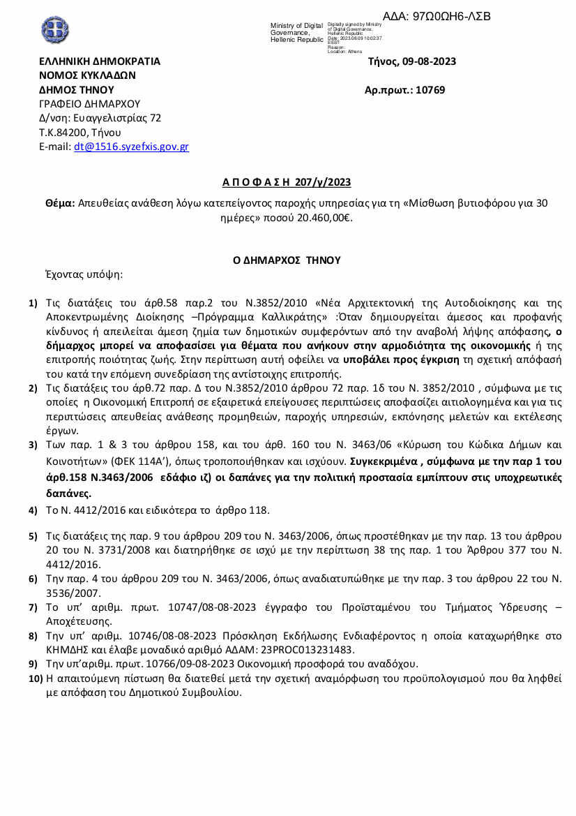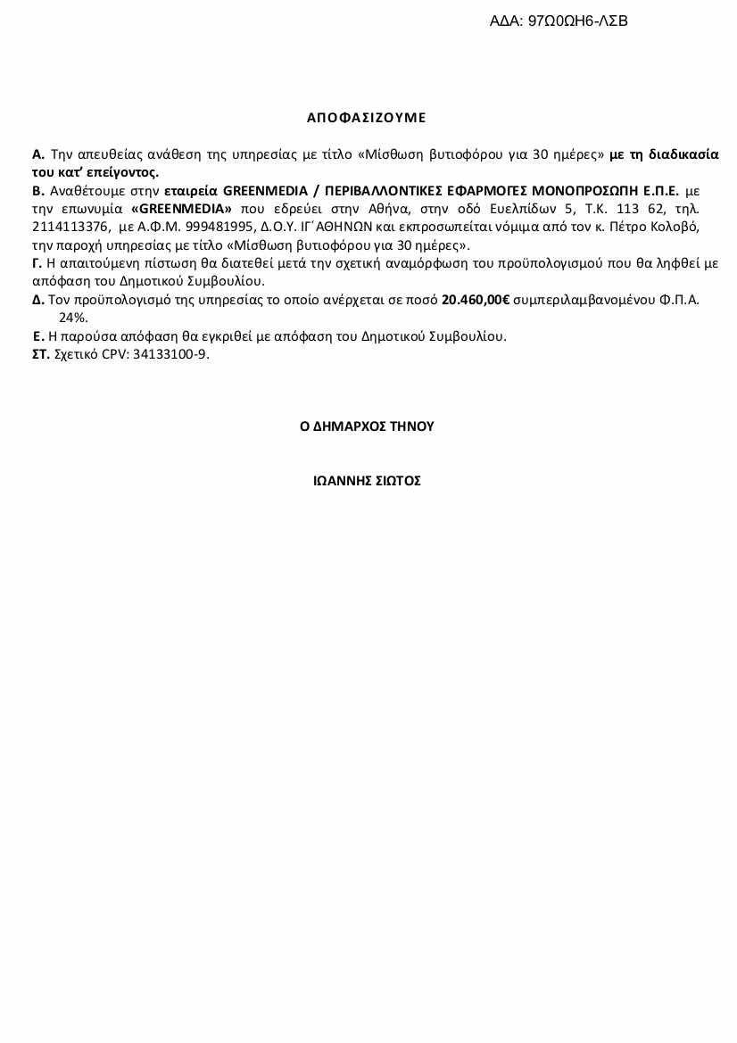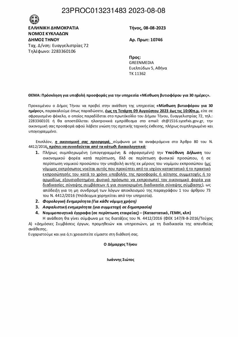 Με μια πρόσκληση για υποβολή προσφοράς που δημοσιεύτηκε στις 8/8/2023 και έληξε στις 9/8/2023 και ώρα 10.00 το πρωί, ο Δήμαρχος Τήνου, έλαβε προσφορά και ανέθεσε απευθείας την μίσθωση ενός βυτιοφόρου για τριάντα (30) ημέρες, με κόστος 20.460,00€, δηλαδή με 680€ την ημέρα! Ενδεικτικά, μπορεί πολύ εύκολα να βρει κανείς στο διαδίκτυο, ανάλογο μοντέλο βυτιοφόρου να ενοικιάζεται για 2 χρόνια, με λιγότερο από 1.000€ ανά μήνα (συνολικό κόστος ~18200€).