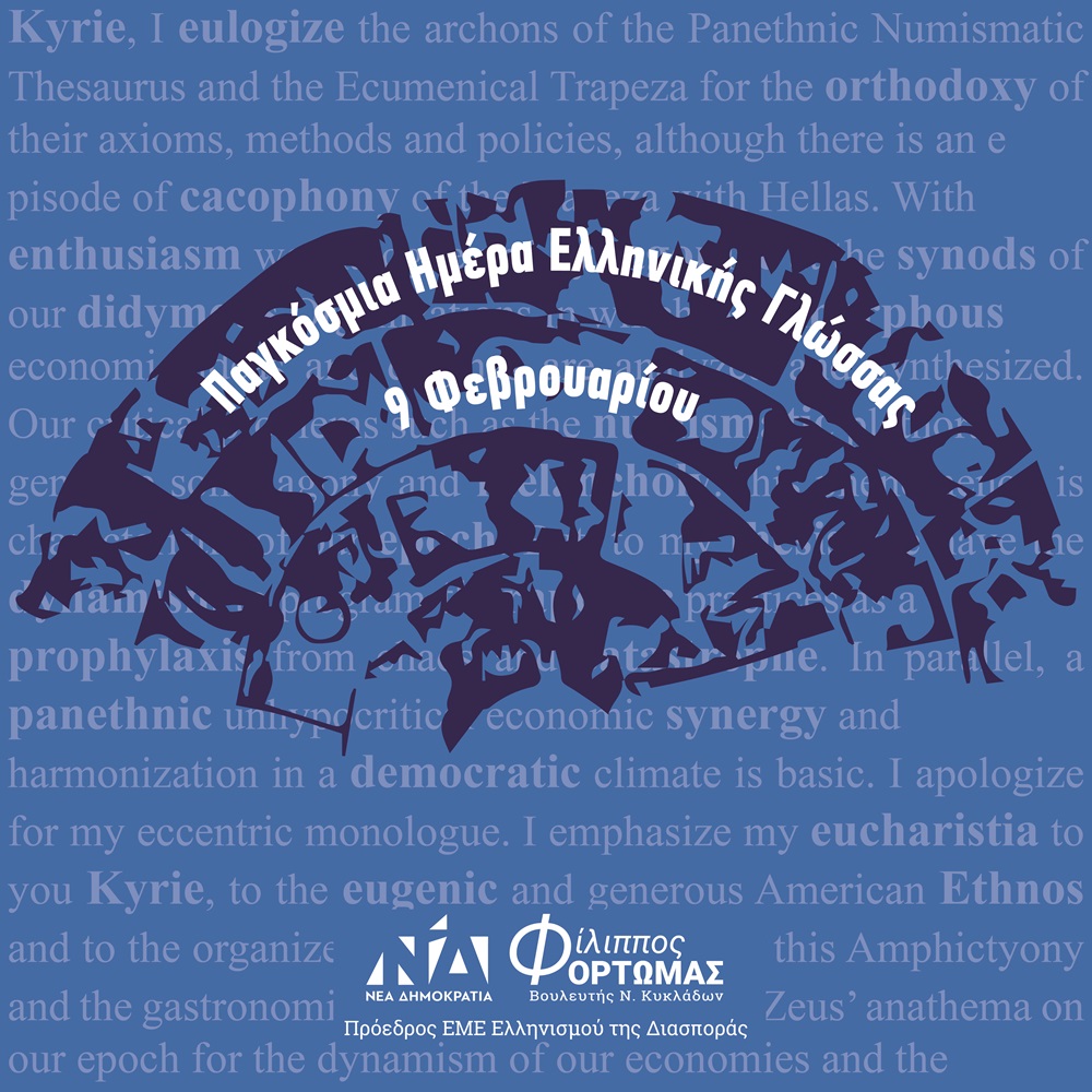«Από το 2017, η 9η Φεβρουαρίου, ημέρα μνήμης του εθνικού ποιητή μας Διονύσιου Σολωμού, έχει καθιερωθεί, με εθνική απόφαση, ως Παγκόσμια Ημέρα Ελληνικής Γλώσσας. Σήμερα λοιπόν όλοι εμείς, οι φυσικοί φορείς ανά την υφήλιο μιας γλώσσας που μετρά αιώνες αδιάλειπτης παρουσίας και καταλυτικής επίδρασης, γιορτάζουμε την Ελληνική Γλώσσα. Την ουσιαστικά παγκόσμια γλώσσα. Φορέα του Λόγου και του παγκόσμιου πολιτισμού.
