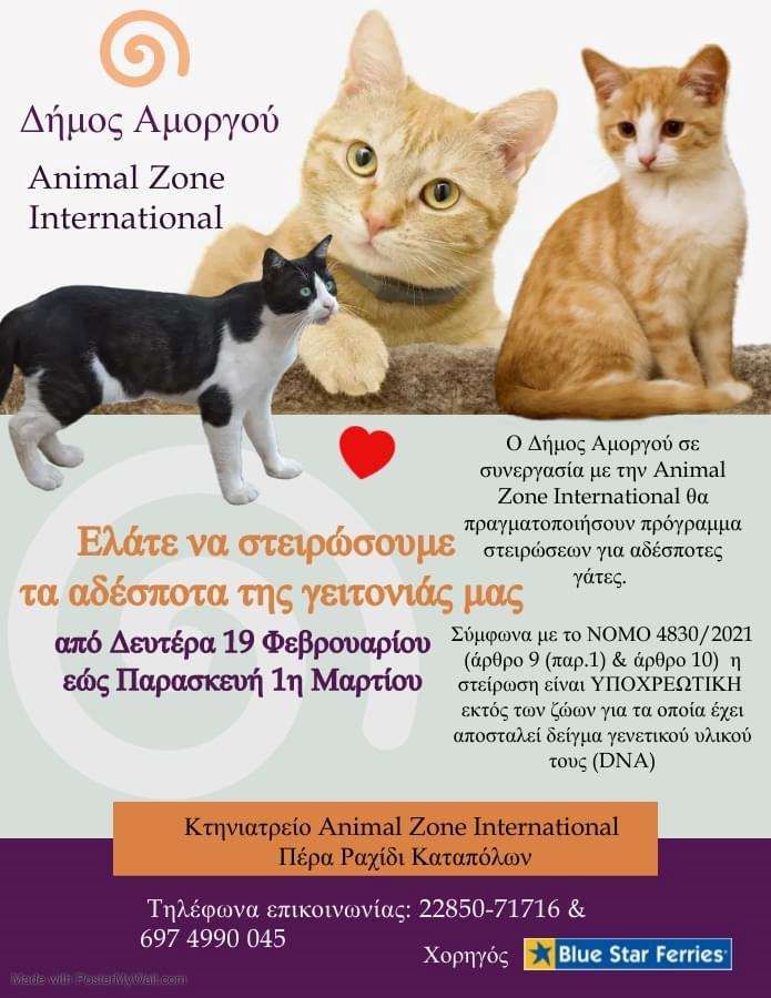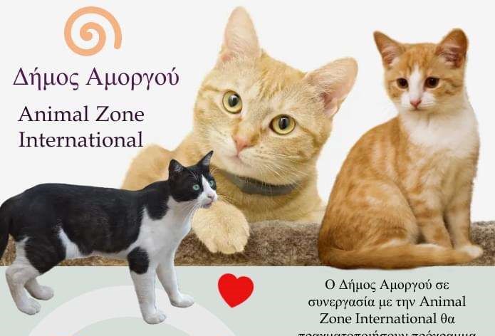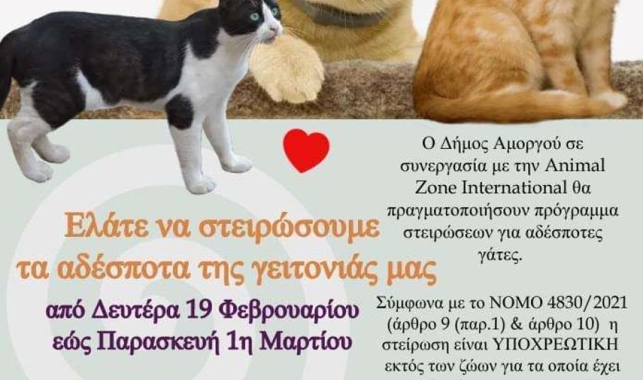 Με το σύνθημα "ελάτε μαζί μας να στειρώσουμε τα αδέσποτα της γειτονιάς μας", ο δήμος Αμοργούκαι και η Animal Zone International, πραγματοποιούν πρόγραμμα στειρώσεων αδέσποτων γατών από σήμερα έως και την Παρασκευή 1 Μαρτίου.
