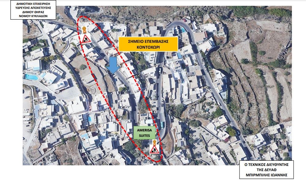 Η Δ.Ε.Υ.Α. Θήρας γνωστοποιεί κυκλοφοριακές ρυθμίσεις στην περιοχή Κοντοχώρι και συγκεκριμένα στο ύψος του ξενοδοχείου Amerisa Suites, λόγω νέας σύνδεσης στο δίκτυο αποχέτευσης.
