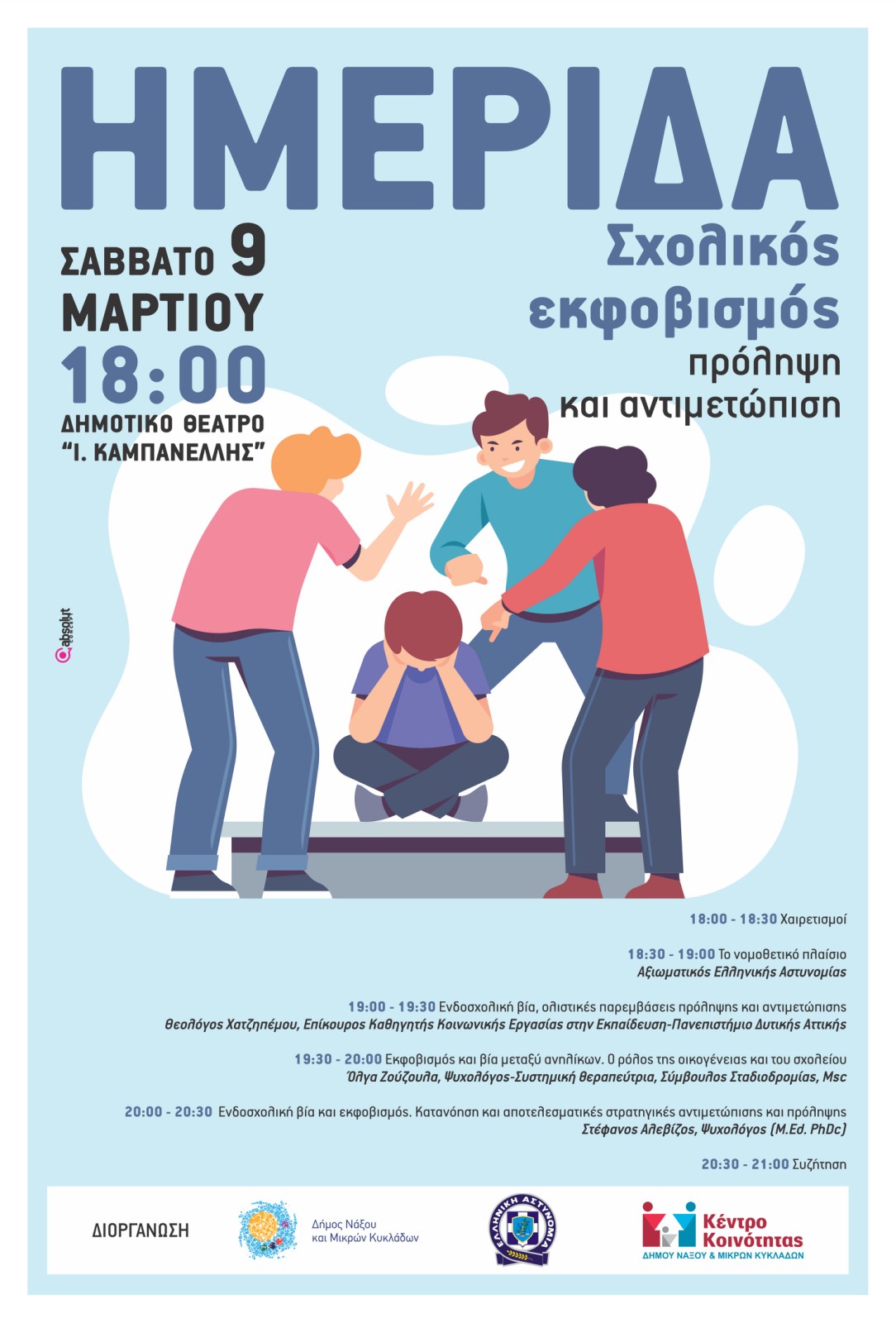 Με αφορμή τη συνεχώς αυξανόμενη παρουσία ανάλογων φαινομένων στις τοπικές μας κοινωνίες και στις σχολικές δομές, ο Δήμος Νάξου και Μικρών Κυκλάδων και το Κέντρο Κοινότητας, σε συνεργασία με την Ελληνική Αστυνομία οργανώνουν ενημερωτική εκδήλωση με θέμα «Σχολικός εκφοβισμός: πρόληψη και αντιμετώπιση».