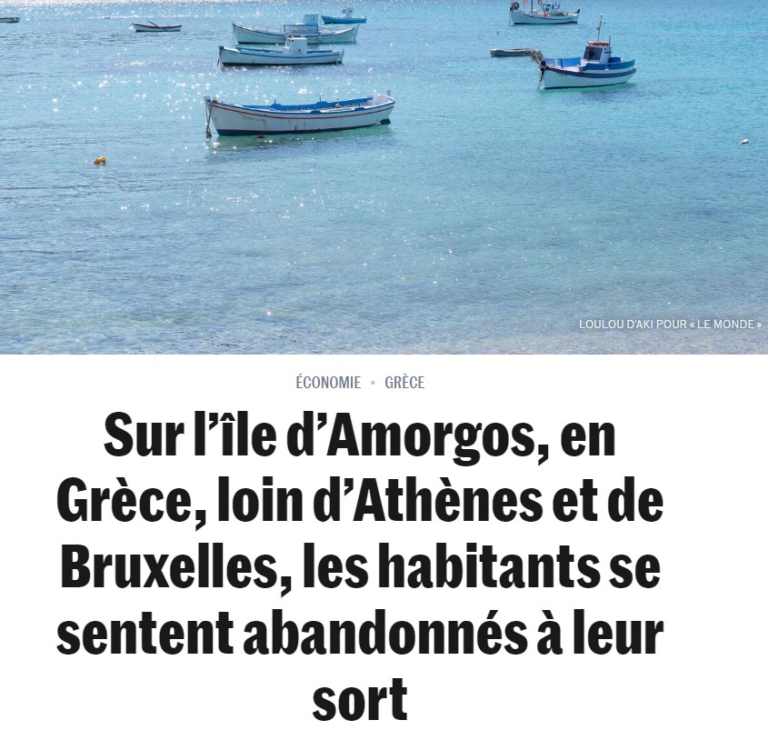 «Στο νησί της Αμοργού, στην Ελλάδα, μακριά από την Αθήνα και τις Βρυξέλλες, οι κάτοικοι αισθάνονται εγκαταλελειμμένοι στη μοίρα τους» είναι ο τίτλος άρθρου της γαλλικής εφημερίδας Le Monde, η οποία ασκεί σκληρή κριτική στη χώρα για την εγκατάλειψη των νησιών της.