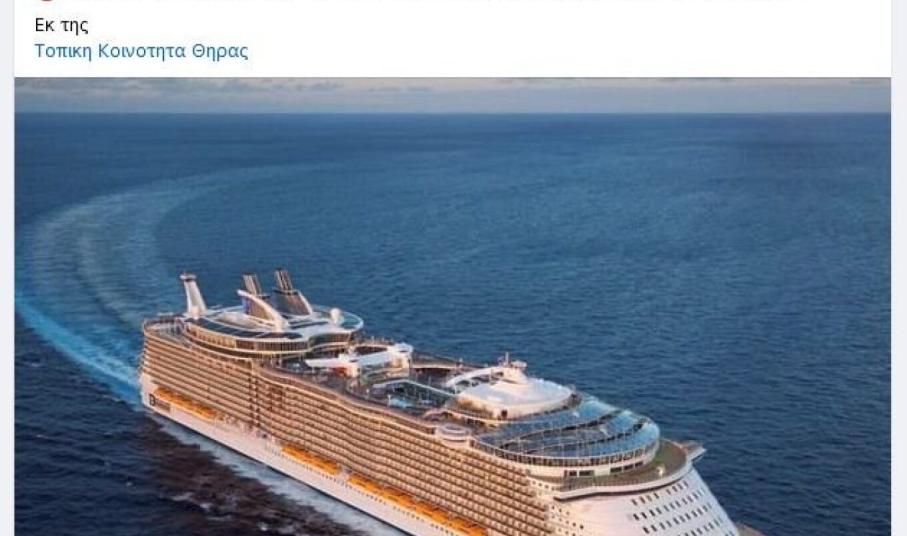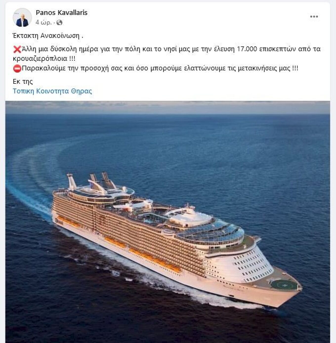 Αρκετό θόρυβο προκάλεσε στα social media μια ανάρτηση του προέδρου της Τοπικής Κοινότητας Θήρας, Πάνου Καβαλλάρη, ο οποίος - ούτε λίγο ούτε πολύ - ζητούσε από τους κατοίκους της Σαντορίνης να περιορίσουν τις μετακινήσεις τους λόγω της επικείμενης άφιξης 17.000 επισκεπτών από κρουαζιερόπλοια!
