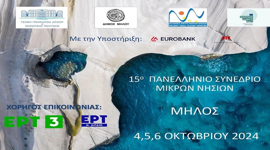 Το 15ο Πανελλήνιο Συνέδριο Μικρών Νησιών, συνδιοργανώνεται από το Ελληνικό Δίκτυο Μικρών Νησιών (ΕΔΜΝ), τον Δήμο Μήλου, τη Γενική Γραμματεία ΕΣΠΑ , τη Γενική Γραμματεία Αιγαίου και Νησιωτικής Πολιτικής, πρέσβεις του Συμφώνου του Κλίματος της ΕΕ στην Ελλάδα, της Ευρωπαϊκής Ομοσπονδίας Δικτύων Μικρών Νησιών και με την υποστήριξη της EUROBANK, της O.T.S. ΑΕ και θα πραγματοποιηθεί το τριήμερο 4 έως και 6 Οκτωβρίου 2024 στο Συνεδριακό κέντρο Μήλου "Γεώργιος Ηλιόπουλος".