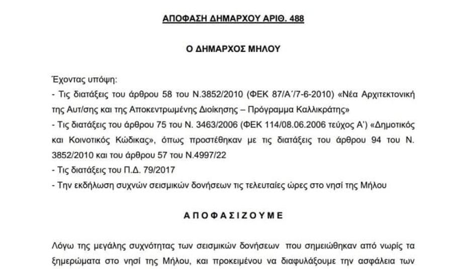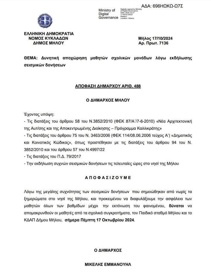 Συνεχόμενοι σεισμοί ταρακούνησαν τη Μήλο - Απόφαση δημάρχου για κλειστά σχολεία
