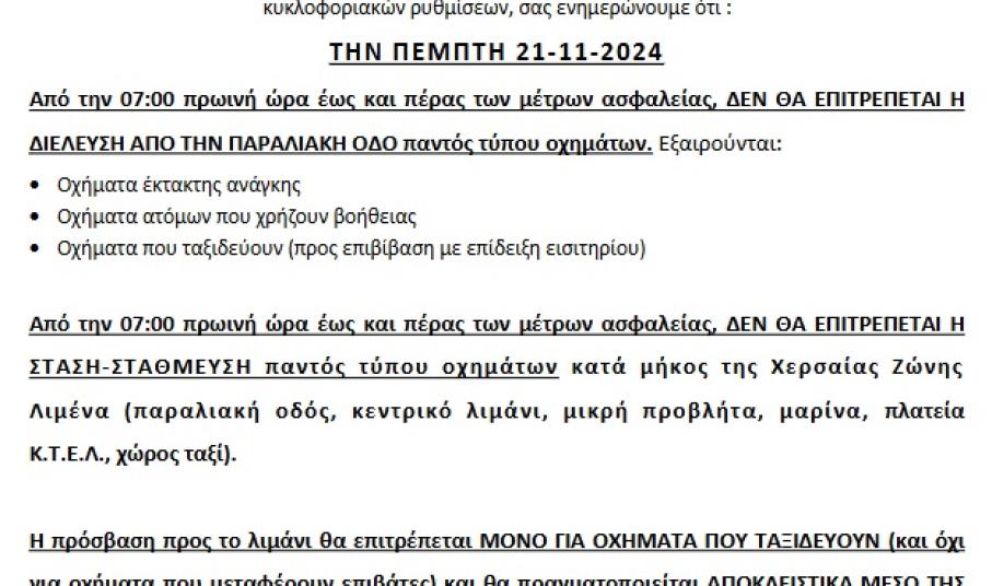 Κυκλοφοριακές ρυθμίσεις στη Χώρα της Νάξου την Πέμπτη 21/11 λόγω εορτασμού της πολιούχου Χώρας Νάξου Παναγίας Χρυσοπολίτισσας, αλλά και λόγω των μέτρων ασφαλείας που αφορούν την επίσκεψη του πρωθυπουργού Κυρ. Μητσοτάκη στο νησί της Νάξου, ανακοίνωσε το Λιμεναρχείο Νάξου.