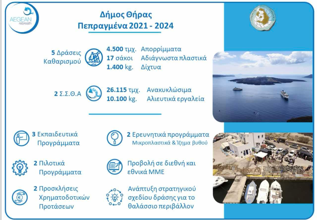 Ο Δήμος Θήρας αποτελεί έναν από τους 20 νησιωτικούς και παράκτιους Δήμους που συνεργάζονται για την ανάπτυξη και εφαρμογή πρακτικών που στοχεύουν στη μείωση της ρύπανσης και την ενίσχυση της περιβαλλοντικής ευαισθητοποίησης. Μάλιστα, σε πίνακα που δημοσίευσε ο Δήμος, παρουσιάστηκαν οι δράσεις και τα πεπραγμένα που έλαβαν χώρα στη Σαντορίνη το τελευταίο διάστημα, με σκοπό την προστασία του θαλασσίου περιβάλλοντος.