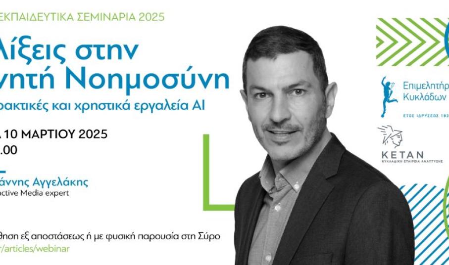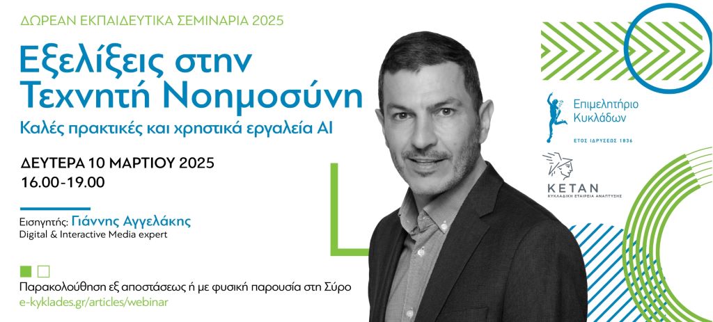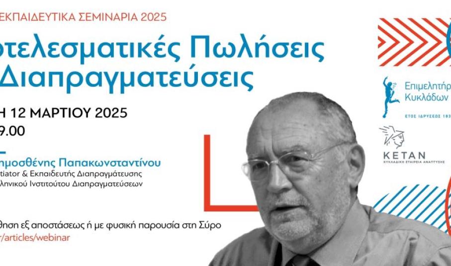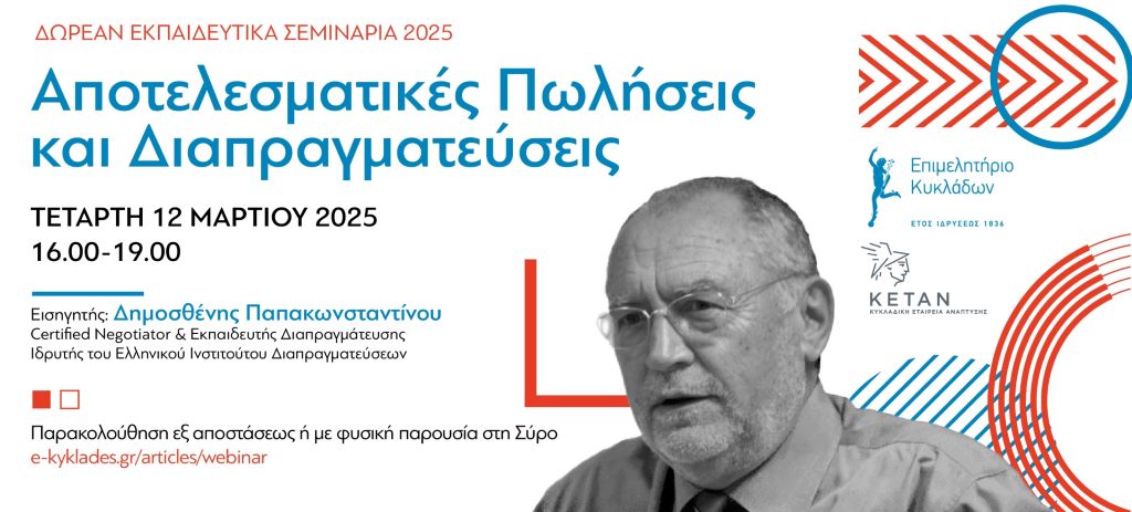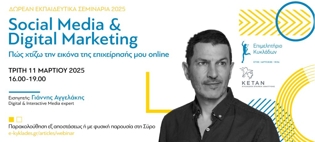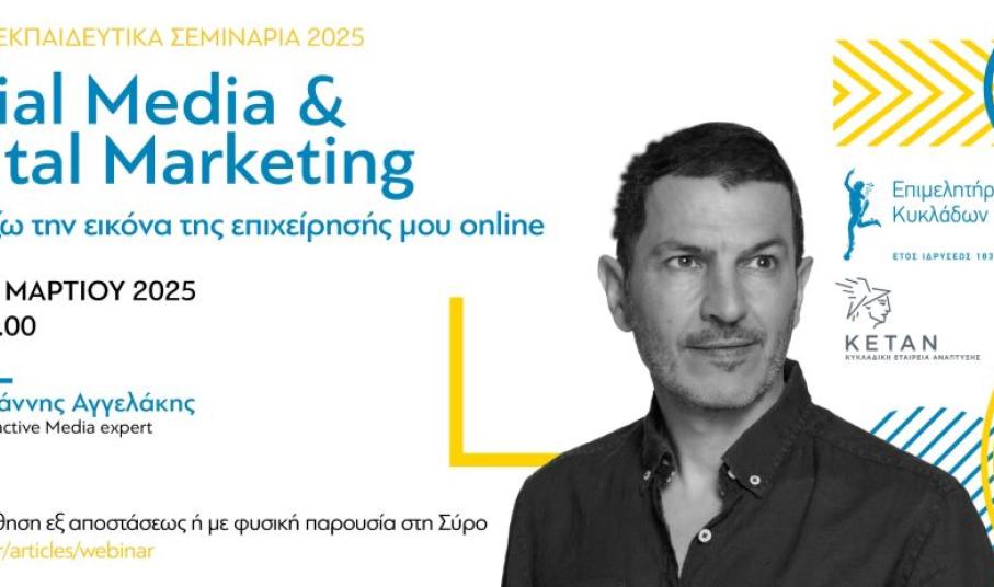 Στο πλαίσιο της διαρκούς εκπαίδευσης και κατάρτισης των μελών του με στόχο την ανάπτυξη των δεξιοτήτων και την προσαρμογή στις νέες εξελίξεις, το Επιμελητήριο Κυκλάδων ανακοινώνει έναν νέο κύκλο δωρεάν σεμιναρίων εστιάζοντας στην τεχνολογία, το ψηφιακό μάρκετινγκ και τις στρατηγικές πωλήσεων.