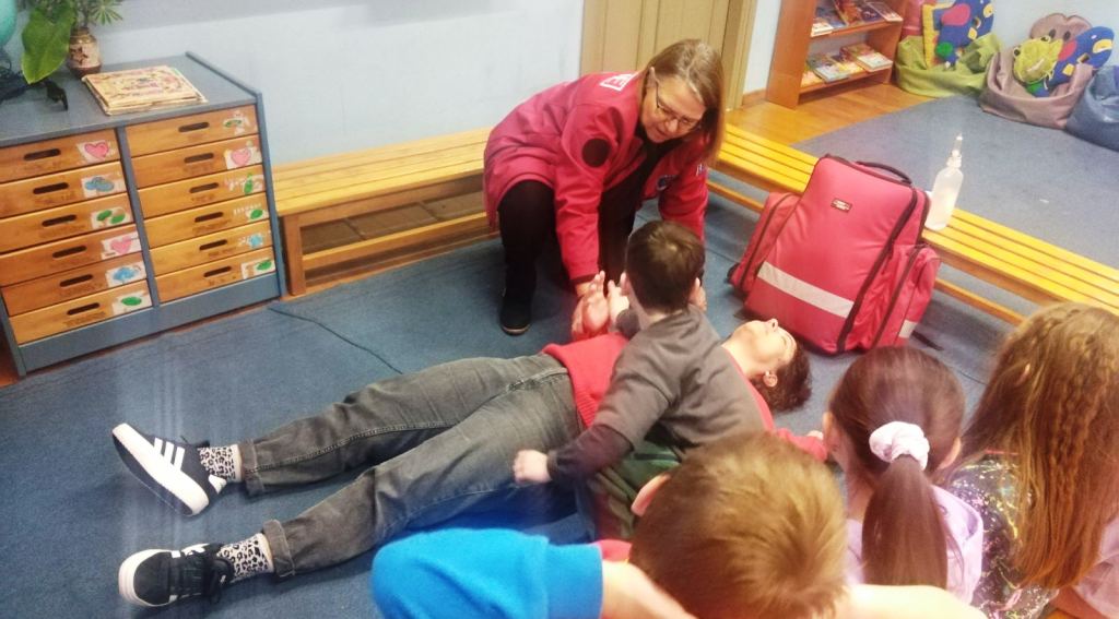 Τα παιδιά έμαθαν πως αντιμετωπίζουμε αιμορραγία, ρινορραγία, εγκαύματα, πνιγμονή, πως τοποθετούμε ένα άτομο σε Θέση Ασφαλείας και πως καλούμε τους διασώστες του ΕΚΑΒ.