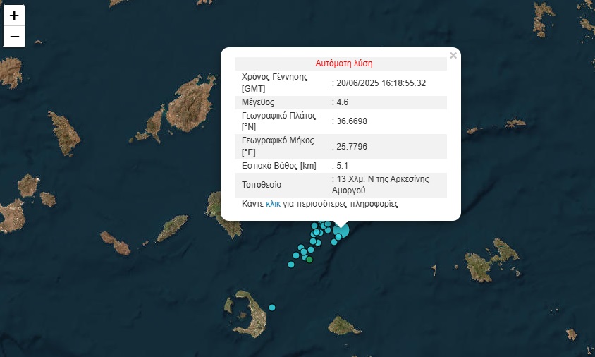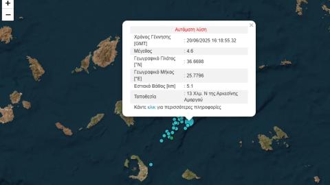 Σεισμική δόνηση 4,6 βαθμών της κλίμακας Ρίχτερ καταγράφηκε το απόγευμα της Παρασκευής, 13 χιλιόμετρα νότια της Αρκεσίνης Αμοργού, σύμφωνα με το Γεωδυναμικό Ινστιτούτο. Το εστιακό βάθος είναι 5,1 χιλιόμετρα και ο σεισμός ήταν αισθητός και στα γύρω νησιά.