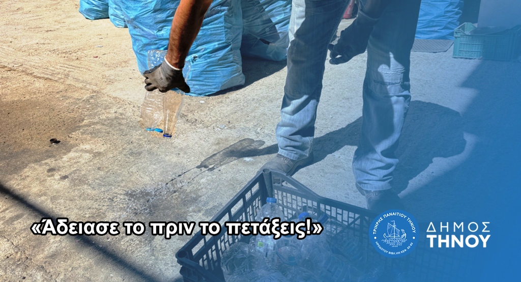 Ο Δήμος Τήνου συνεχίζει τις δράσεις ευαισθητοποίησης για την ανακύκλωση με ένα νέο σύντομο βίντεο που υπενθυμίζει μια απλή αλλά σημαντική συνήθεια: να αδειάζουμε τις συσκευασίες πριν τις πετάξουμε στον κάδο ανακύκλωσης.