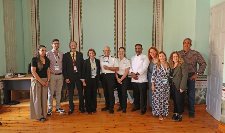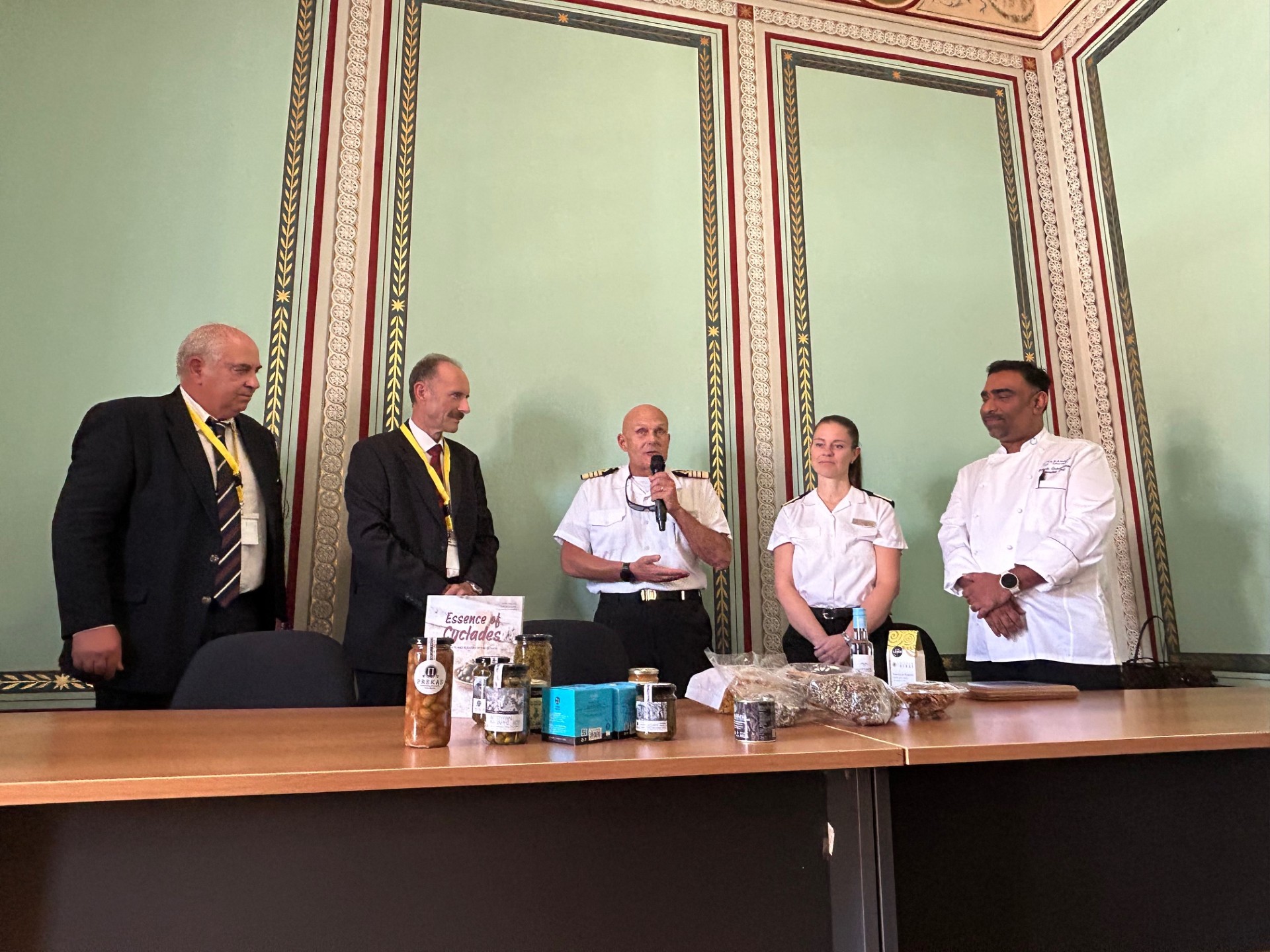 Το Επιμελητήριο Κυκλάδων, στο πλαίσιο επαφών με εταιρείες του κλάδου με σκοπό την προώθηση των τοπικών προϊόντων που φέρουν το σήμα ποιότητας Aegean Cuisine, κάλεσε τον Πλοίαρχο, τον Σεφ και μέλη του πληρώματος κρουαζιερόπλοιου του Ομίλου AZAMARA, που βρισκόταν στη Σύρο κατά τη διάρκεια του διημέρου. Η πρόσκληση έγινε αποδεκτή και το μεσημέρι της Παρασκευής 17 Οκτωβρίου πραγματοποιήθηκε συνάντηση σε πολύ θερμό κλίμα (φωτογραφία).