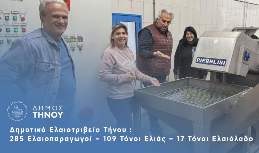 Ολοκληρώθηκε η φετινή περίοδος λειτουργίας του ελαιοτριβείου του Δήμου Τήνου, από τη –υπό εκκαθάριση– Δημοτική Επιχείρηση, το οποίο εξυπηρέτησε 285 ελαιοπαραγωγούς, όχι μόνο από το νησί μας, αλλά και από τα γειτονικά νησιά. Κατά την περίοδο από τις 17 Οκτωβρίου έως και τις 2 Δεκεμβρίου 2025, επεξεργάστηκαν συνολικά 109 τόνοι ελιάς, παράγοντας 17 τόνους ελαιόλαδου. Η επιτυχία της φετινής περιόδου οφείλεται στη συνεργασία, την αφοσίωση και την εργατικότητα όλων όσοι συνέβαλαν στη λειτουργία του ελαιοτριβείου. Ιδιαίτερες ευχαριστίες απευθύνονται στην πρόεδρο Μαρία Δενεκαρία και στο Διοικητικό Συμβούλιο της επιχείρησης, καθώς και στην αρμόδια υπάλληλο Ιουλία Μοσχολιού, οι οποίες είχαν διαρκή παρουσία και καθοριστικό ρόλο στην εύρυθμη λειτουργία του ελαιοτριβείου. Ευχαριστούμε επίσης θερμά τους εξωτερικούς συνεργάτες μας που εργάστηκαν με συνέπεια για το καλύτερο δυνατό αποτέλεσμα. Τεχνικός της εταιρείας που παρακολουθεί τη λειτουργία του ελαιοτριβείου βρέθηκε κατά το κλείσιμο της περιόδου στη νησί μας, προκειμένου να διασφαλιστεί η σωστή συντήρηση και η ετοιμότητα των μηχανημάτων για την επόμενη χρονιά. Η Δημοτική Αρχή εκφράζει την ικανοποίησή της για τη θετική ανταπόκριση των ελαιοπαραγωγών του νησιού και δεσμεύεται να συνεχίσει να αναβαθμίζει συνεχώς τη λειτουργία του Ελαιοτριβείου και του Σφαγείου ως Δημοτικές Υπηρεσίες, μετά την αλλαγή του νομικού καθεστώτος που έγινε με πρωτοβουλία του Δήμου μας. Η στήριξη του πρωτογενή τομέα, όπως έχουμε αποδείξει με την πορεία μας μέχρι τώρα είναι για εμάς προτεραιότητα.