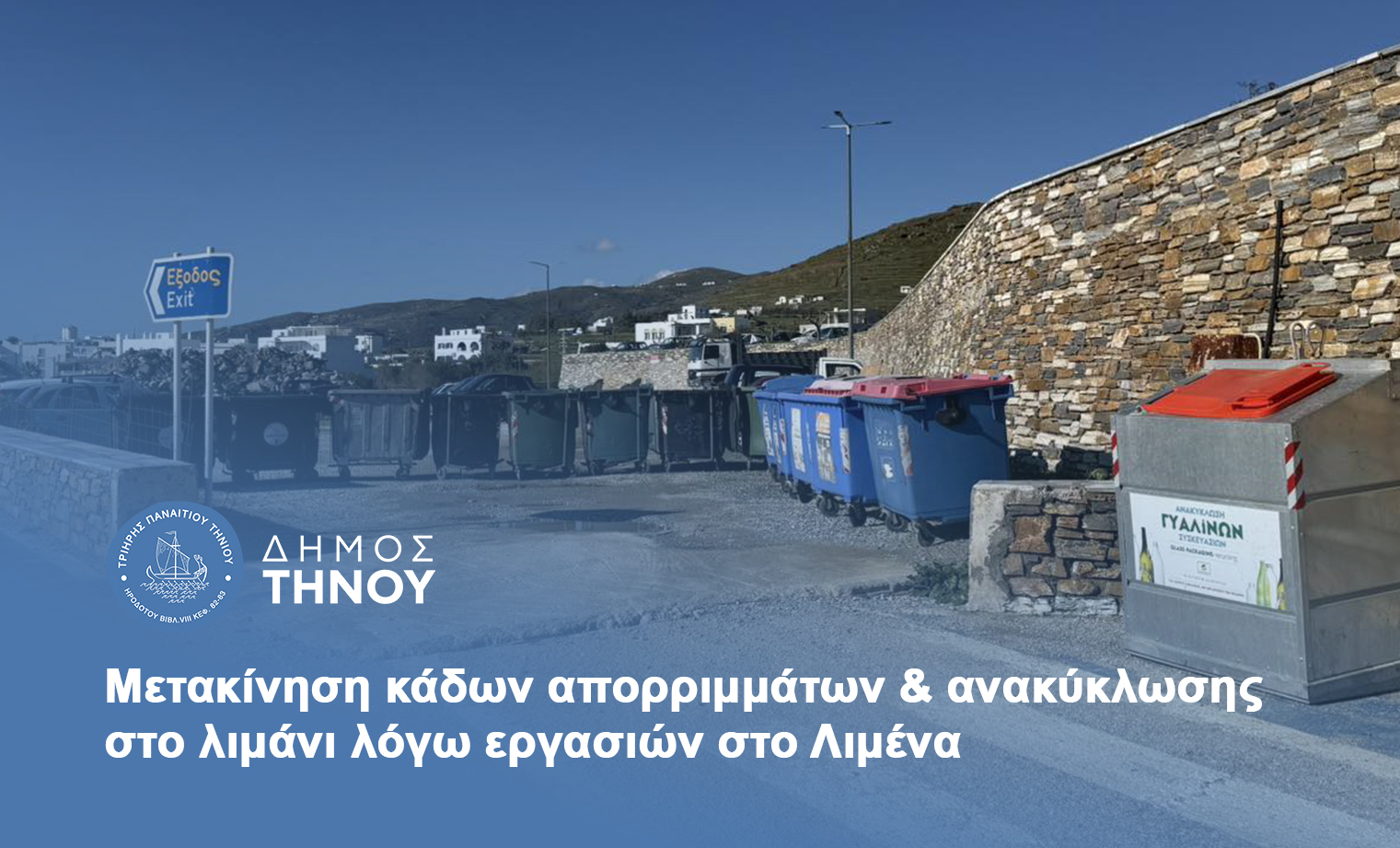 Ο Δήμος Τήνου ενημερώνει τους δημότες νησιού ότι πραγματοποιήθηκε μετακίνηση των κάδων απορριμμάτων & ανακύκλωσης στην απέναντι είσοδο στο χωμάτινο πάρκινγκ (όπως διακρίνεται στην φωτογραφία).