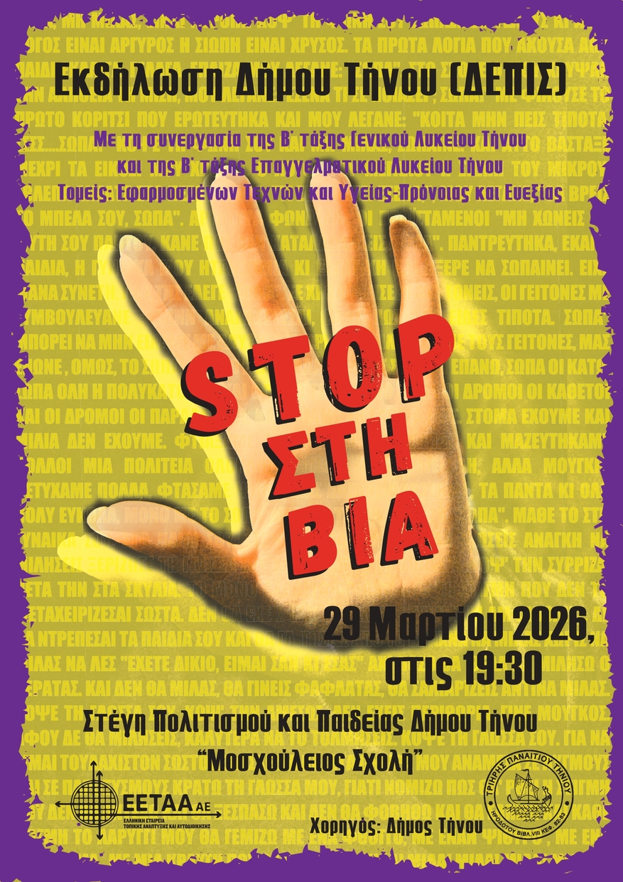 Εκδήλωση με θέμα “STOP στη Βία, Ας προσπαθήσω…λίγο ακόμα…να είναι δικιά μου η ζωή”, διοργανώνει η Δημοτική Επιτροπή Ισότητας του Δήμου Τήνου (ΔΕΠΙΣ), σε συνεργασία με μαθητές της Β’ Τάξης του Γενικού Λυκείου και του Επαγγελματικού Λυκείου του νησιού.