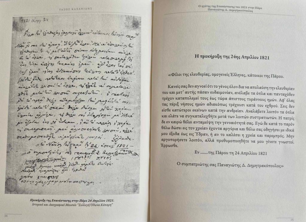 Η 24η Απριλίου αποτελεί για την Πάρο ημέρα ιστορικής μνήμης και εθνικής υπερηφάνειας. Στις 24 Απριλίου του 1821, ο Παναγιώτης Δημητρακόπουλος, επικεφαλής της Φιλικής Εταιρείας στο νησί μας, με προκήρυξή του προς τους Παριανούς, ύψωσε το λάβαρο της Επανάστασης και κήρυξε την έναρξη του Αγώνα στην Πάρο, εντάσσοντας το νησί μας στη μεγάλη εθνική προσπάθεια για την αποτίναξη του οθωμανικού ζυγού.