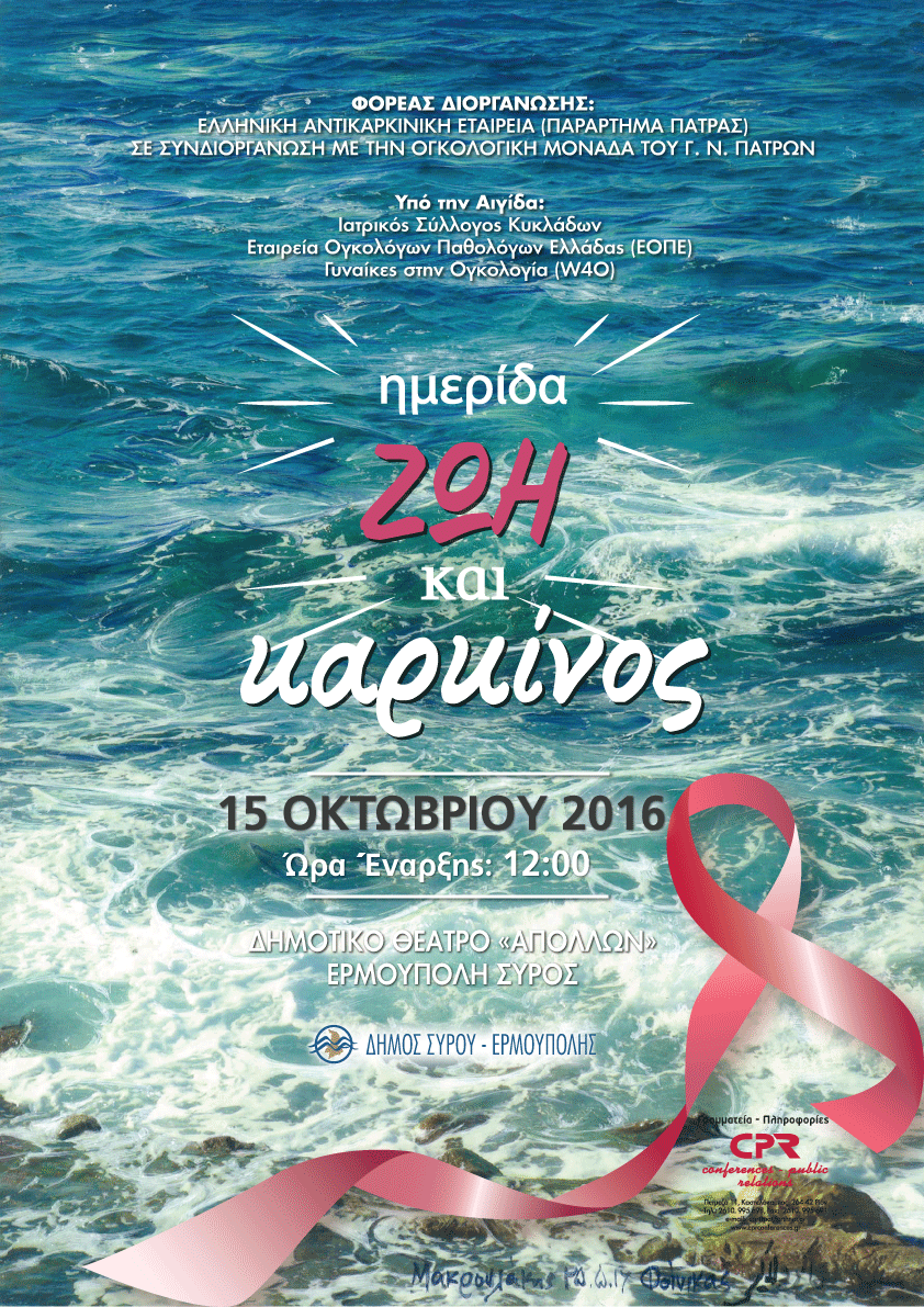 Η Ελληνική Αντικαρκινική Εταιρεία, μετά από πολύχρονη και αδιάλειπτη λειτουργία με μοναδικό σκοπό την προστασία της υγείας όλων των πολιτών, χωρίς μόνιμα έσοδα, παρ’ όλη την οικονομική κρίση που δοκιμάζει τη χώρα μας, σε συνεργασία με την Ογκολογική Μονάδα του Γ.Ν. Πατρών, διοργανώνει Ημερίδα με θέμα: «Ζωή και Καρκίνος». Η Ημερίδα θα πραγματοποιηθεί το Σάββατο 15 Οκτωβρίου και ώρα 12:00 στην Ερμούπολη Σύρου, στο Θέατρο Απόλλων.