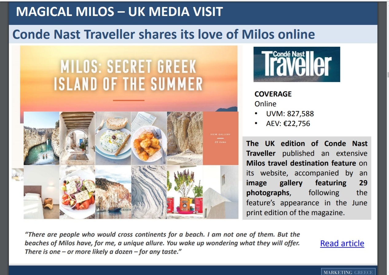 Το Conde Nast Traveller, UK δημοσίευσε ένα 10σέλιδο αφιέρωμα για τη Μήλο, εστιάζοντας στην ιστορία και στον πολιτισμό του νησιού, τις παραλίες, τη γαστρονομία και τη φιλοξενία. Στον ιστότοπο του Conde Nast Traveller, UK δημοσιεύθηκε ένα αφιέρωμα για τη Μήλο που συνοδεύεται από 29 φωτογραφίες του νησιού. Στη Βελγική έκδοση του ELLE, δημοσιογράφος Celine Pecheux ανακαλύπτει τη μαγεία των οικογενειακών διακοπών.