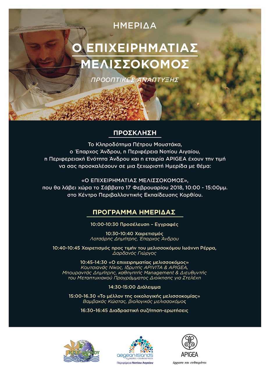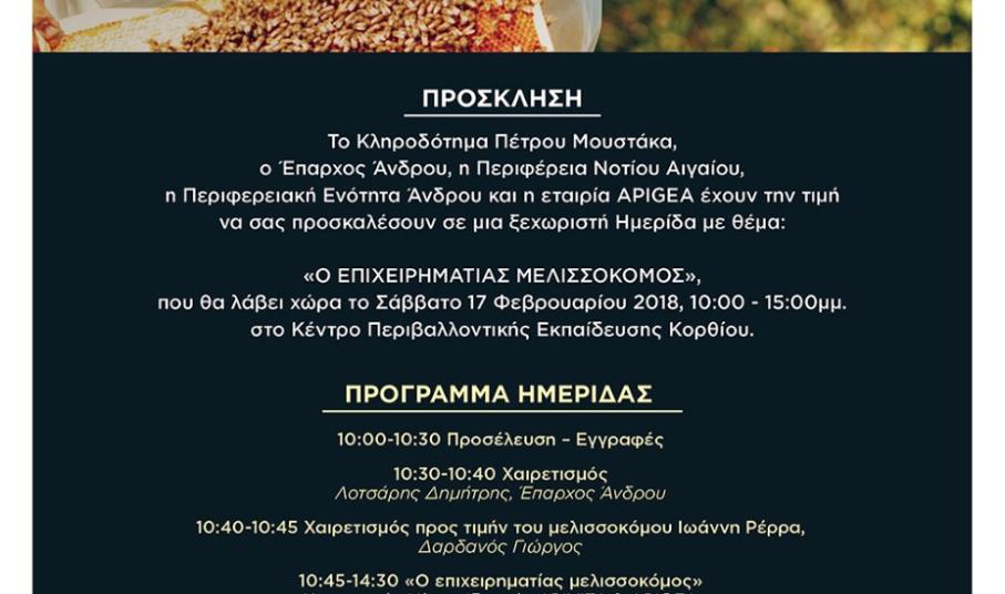 Η Περιφερειακή Ενότητα Άνδρου, το Κληροδότημα Πέτρου Λ. Μουστάκας και η εταιρεία APIGEA διοργανώνουν Ημερίδα με θέμα " Ο ΕΠΙΧΕΙΡΗΜΑΤΙΑΣ ΜΕΛΙΣΣΟΚΟΜΟΣ", που θα πραγματοποιηθεί το Σάββατο 17 Φεβρουαρίου 2018, (10.00 - 15.00μ.μ.) στο Κέντρο Περιβαλλοντικής Εκπαίδευσης Κορθίου.